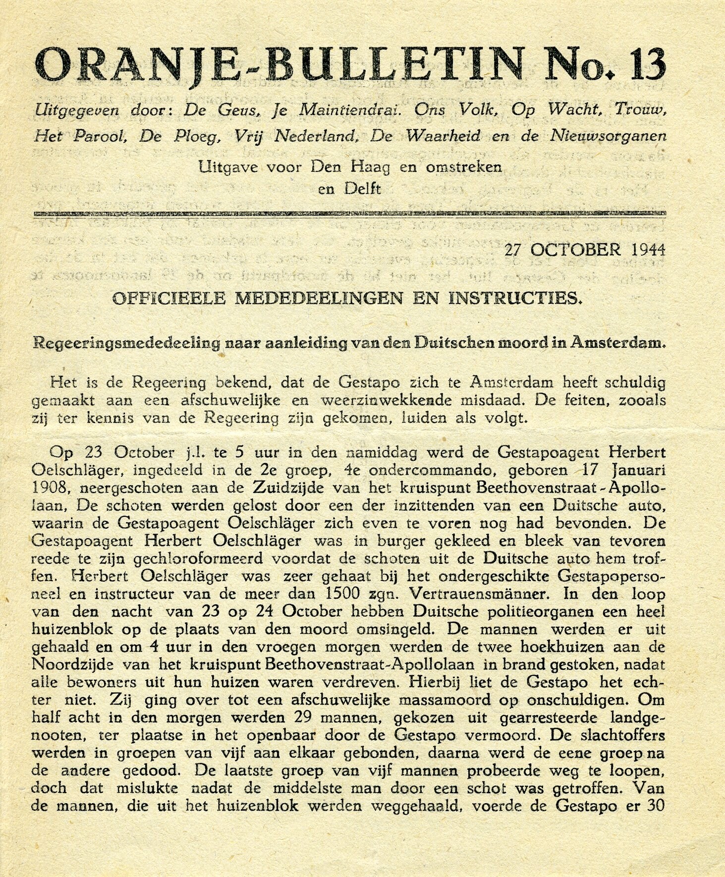 Twee gedrukte uitgaven van het "Oranje-Bulletin": No. 12 van 25 October met onder andere "De zuivering van den Hoogen Raad" en "Mededeelingen van de samenwerkende illegale organisaties”; No. 13 van 27 October 1944 met onder andere de "Regeeringsmededeeling naar aanleiding van den Duitschen moord in Amsterdam" en "Mededeelingen van de samenwerkende illegale organisaties".