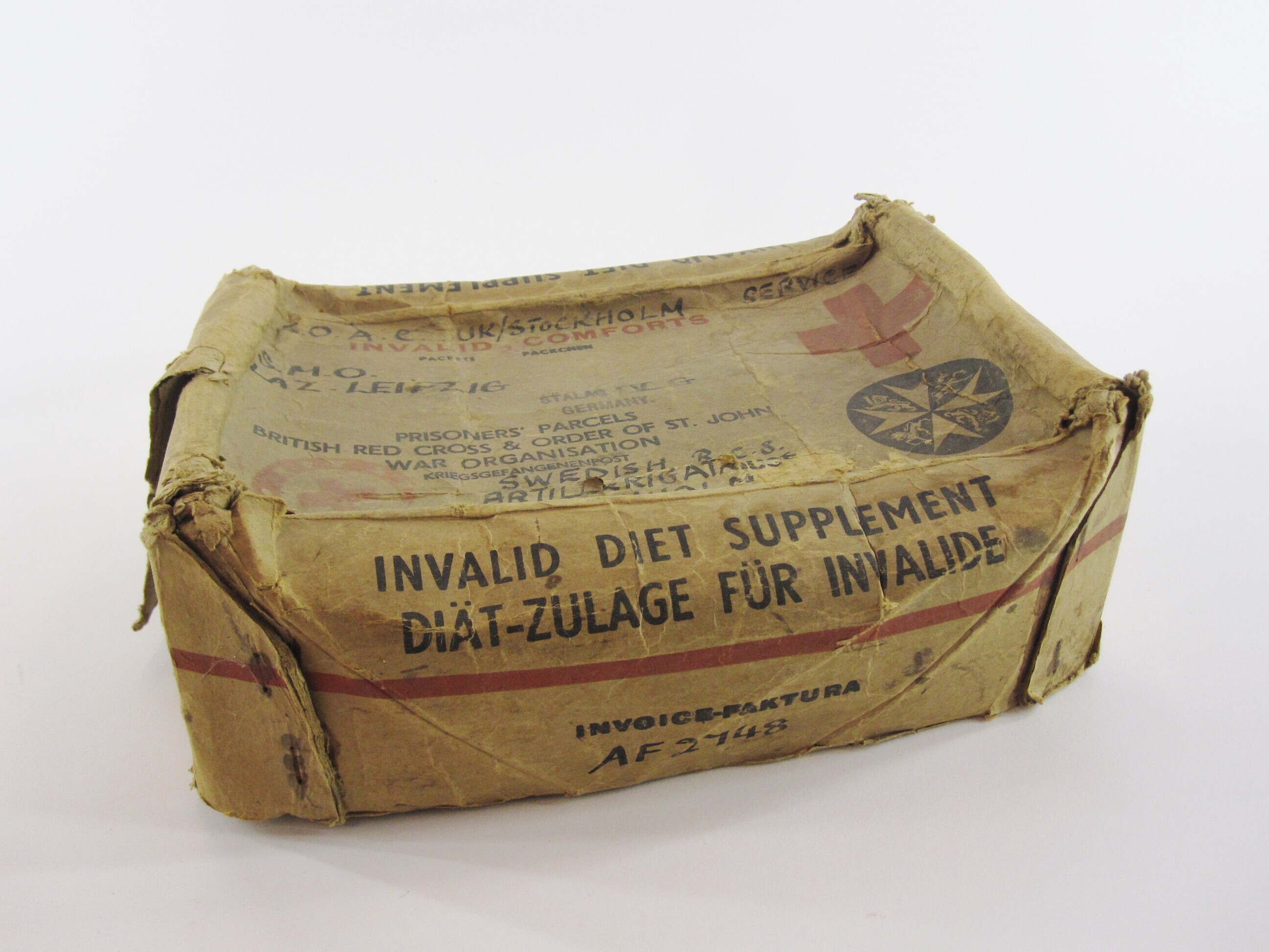 De lege kartonnen doos van een voedselpakket voor een invalide krijgsgevangene. Op het deksel staat geschreven en gedrukt: "B.O.A.C. UK/Stockholm Service. Invalid Comforts. Packets Packchen. S.M.O. LAZ. Leipzig. Stalag IV G Germany. Prisoner's Parcels Britisch Red Cross & Order of St. John War Organisation. Kiregsgefangenenpost. Swedish R.C.S. Artillerigata... Stockholm". Op de zijkanten: "Invalid Diet Supplement. Diät-Zulage für Invalide. Invoice-Factura AF 2748".