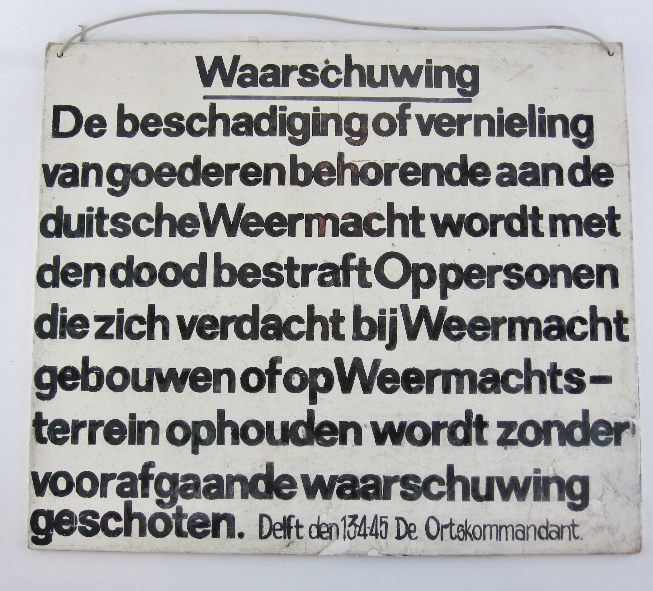 Een houten wit geverfd mededelingenbord met op een kant met zwarte letters: "Waarschuwing. De beschadiging of vernieling van goederen behorende aan de duitschen Weermacht wordt met den dood bestraft. Op personen die zich verdacht bij Weermachtgebouwen of op Weermachtsterrein ophouden wordt zonder voorafgaande waarschuwing geschoten. Delft den 13445 De Ortskommandant."