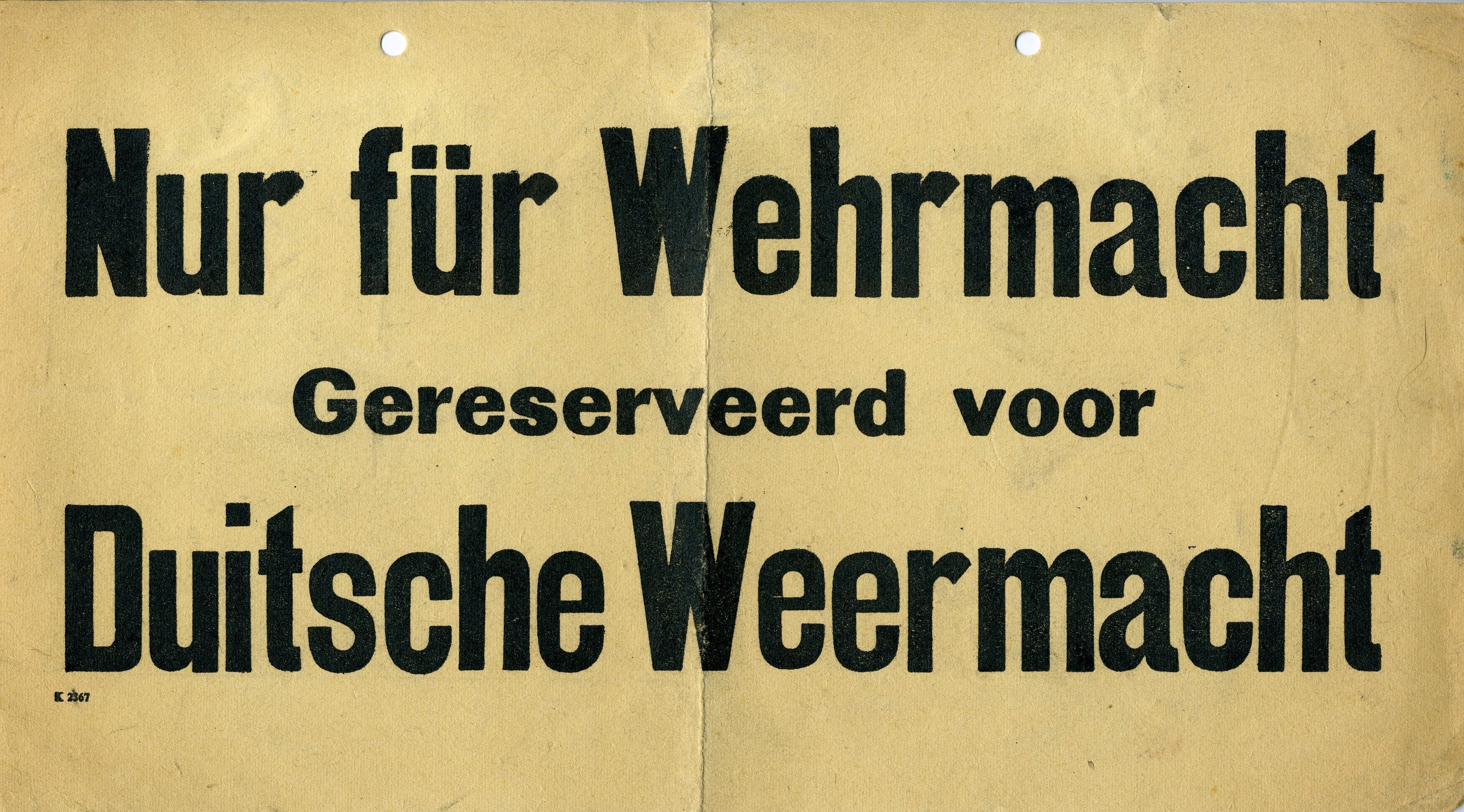Een rechthoeking papier met aan beide zijden de tekst: "Nur fÂur Wehrmacht. Gereserveerd voor Duitsche Weermacht'. Dit soort aanplakbiljetten werd in gereserveerde treinwagons opgehangen.
