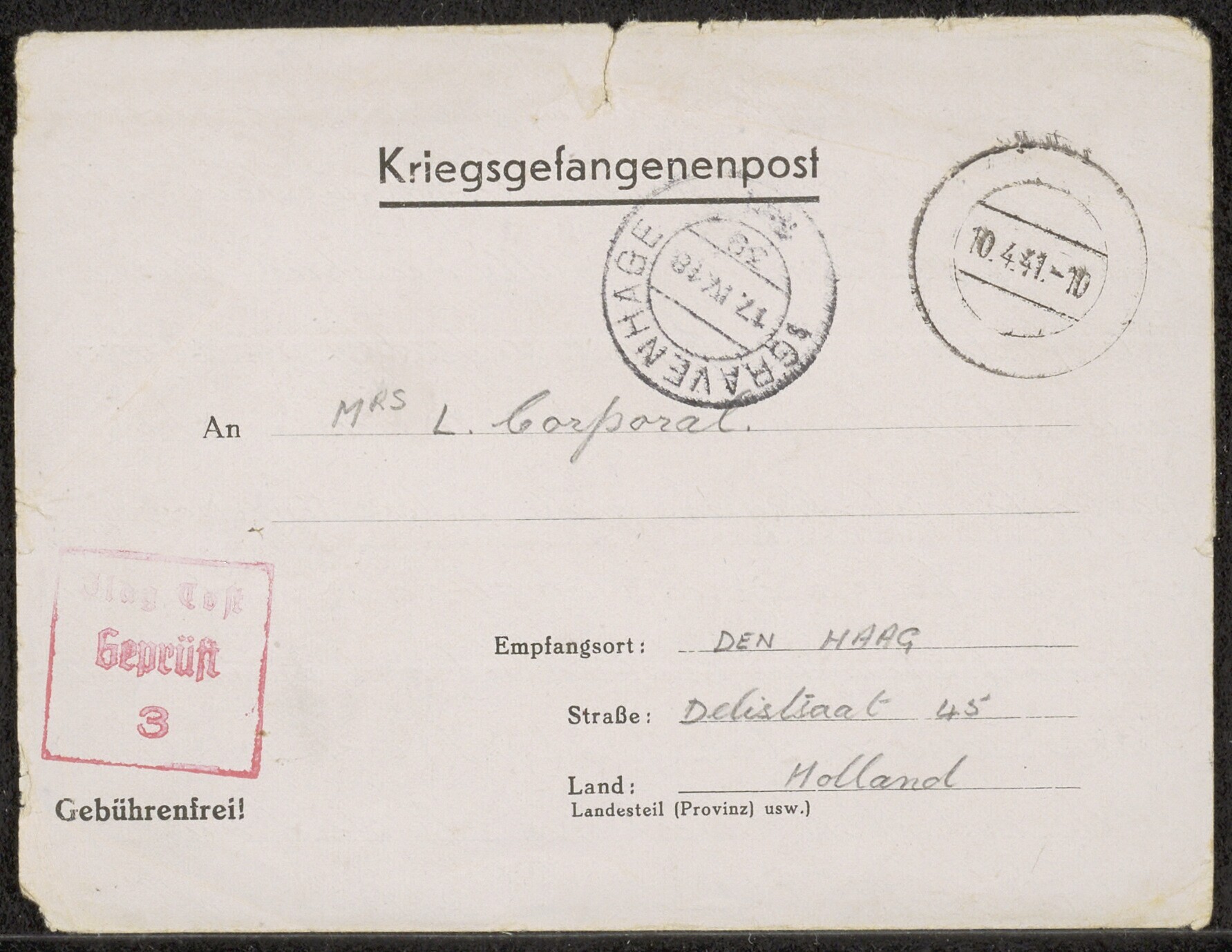 Vier briefkaarten en twee brieven met potlood in het Engels geschreven en verzonden gedurende 1941 uit een krijgsgevangenenkamp in Duitsland door: "Percy A. Bramhall; Gefangenennummer: 941" aan: "Mrs. L. Corporaal, Delistraat 45, Den Haag, Holland". Op de adreszijde staat bovenaan: "Kriegsgefangenenpost" en staat per correspondentiestuk een rood stempel van goedkeuring door het kamp, een poststempel met datum en "Gebührenfrei!"