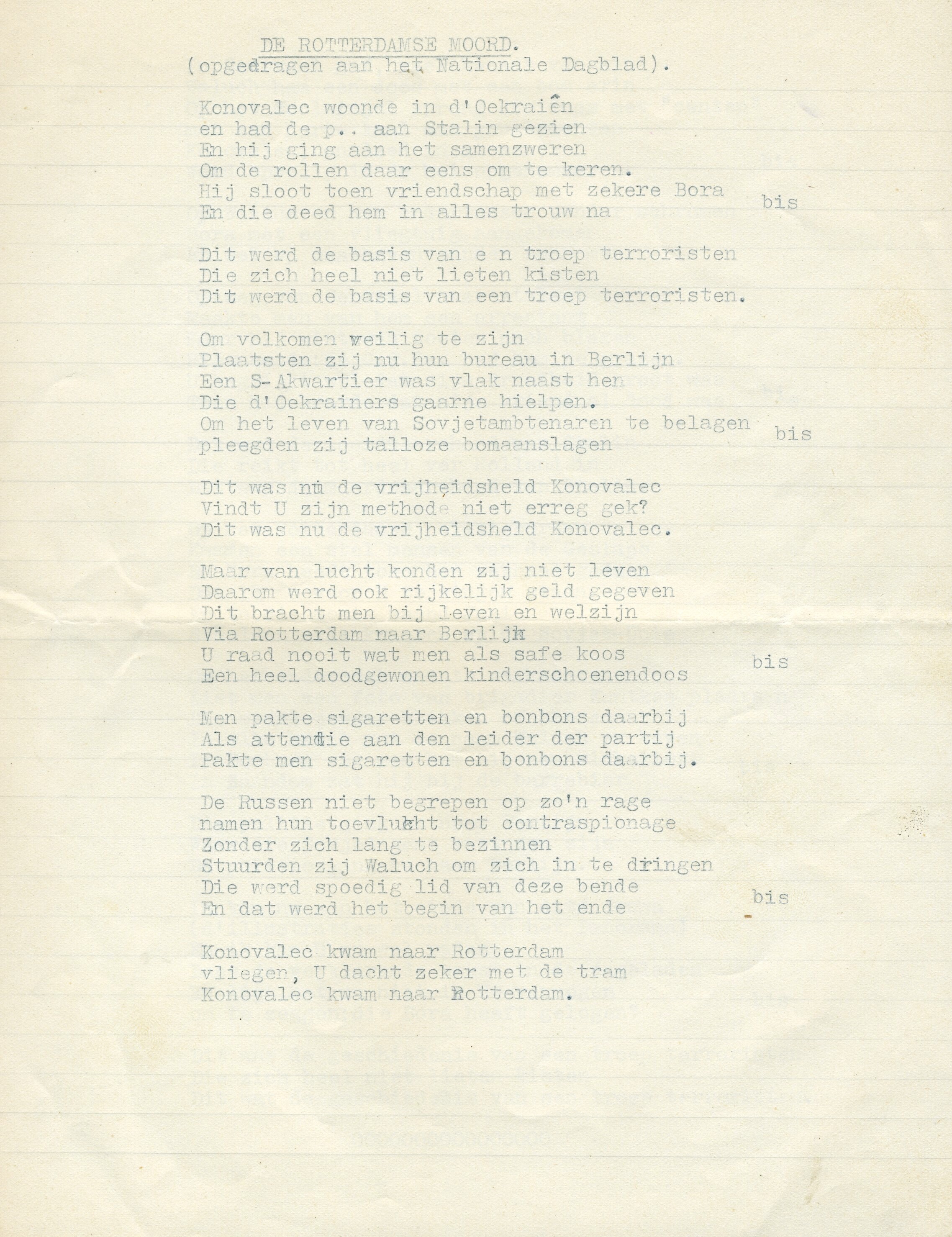 Een gedicht met de titel: "De Rotterdamse Moord. (opgedragen aan het Nationale Dagblad)" gaat over de moordaanslag op Jevhen Konovalets (Jevgeni Konovalec) de leider van de Organisatie van Oekraïense Nationalisten door een agent van de Sovjet Veiligheidsdienst NKVD te Rotterdam op 23 mei 1938. het gedicht is getypt op twee vellen gelinieerd papier en opgeborgen in een blauw papieren omslag.