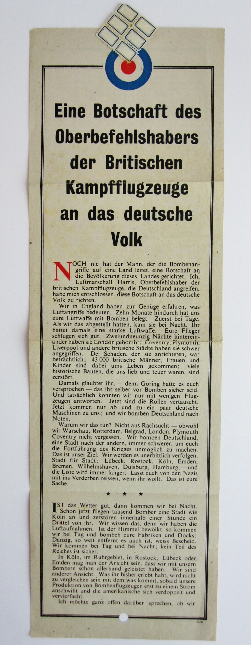 Een pamflet met als kop: "Eine Botschaft des Oberbefehlshabers der Britischen Kampfflugzeuge an das deutsche Volk". In het pamflet wordt de reden van het bombarderen van Duitse steden aangegeven en het Duitse volk wordt opgeroepen zich af te keren van Nazipartij, zodat het tot vrede kan komen. De boodschap is ondertekend door "A.T. Harris Air Marshal R.A.F."