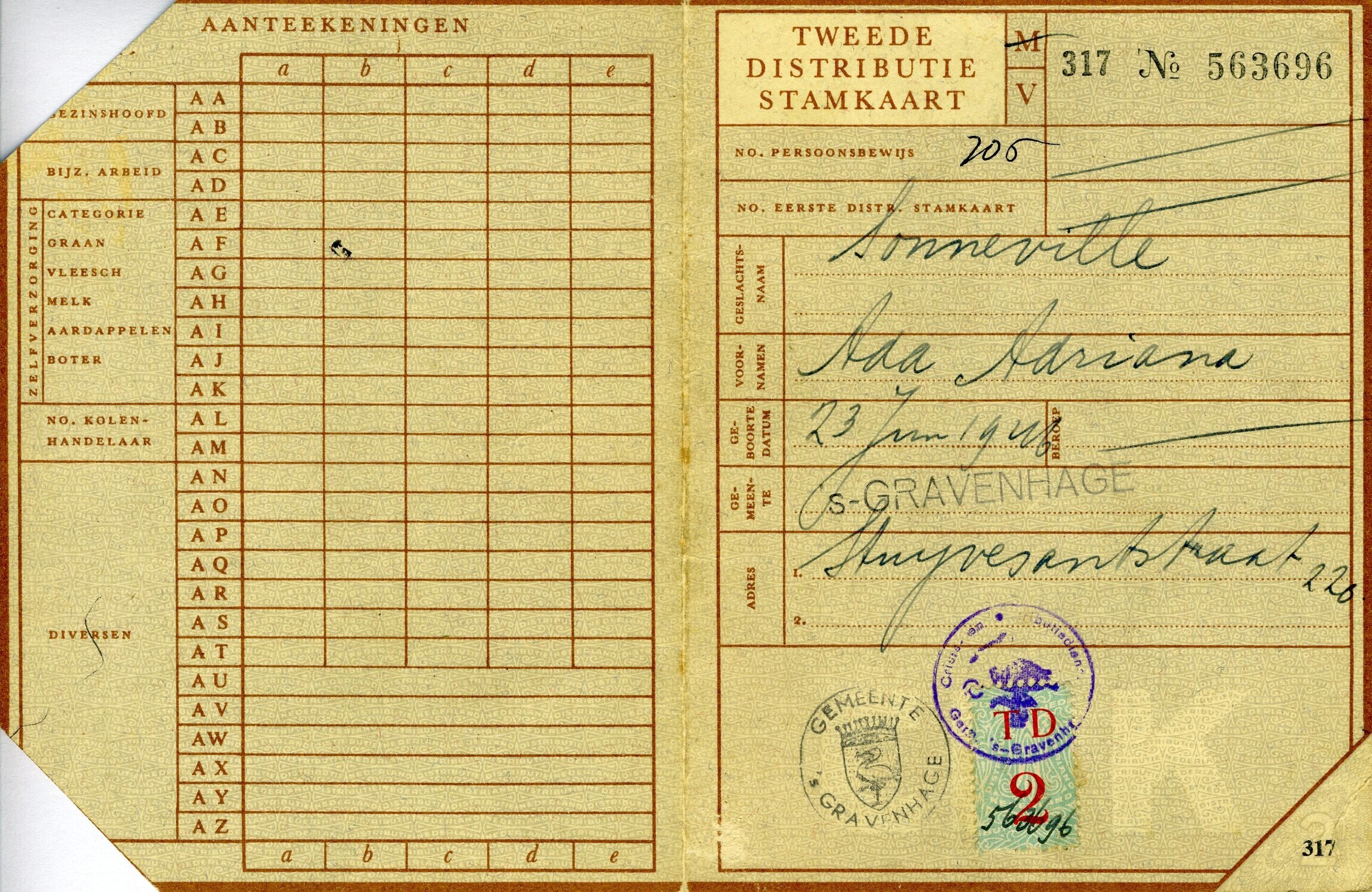 Een "Tweede Distributie Stamkaart" uitgegeven te Den Haag op naam van Ada Adriana Sonneville geboren op 23 juni 1946.