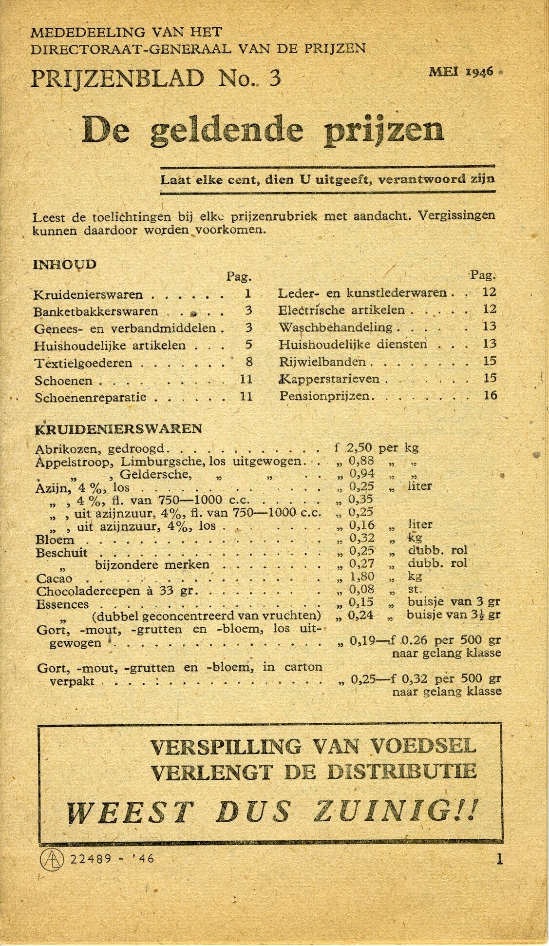 Een boek van mei 1946 uitgegeven door het Directoraat-Generaal van de prijzen met een lijst van "De geldende prijzen" van kruidenierswaren tot en met pensionprijzen.