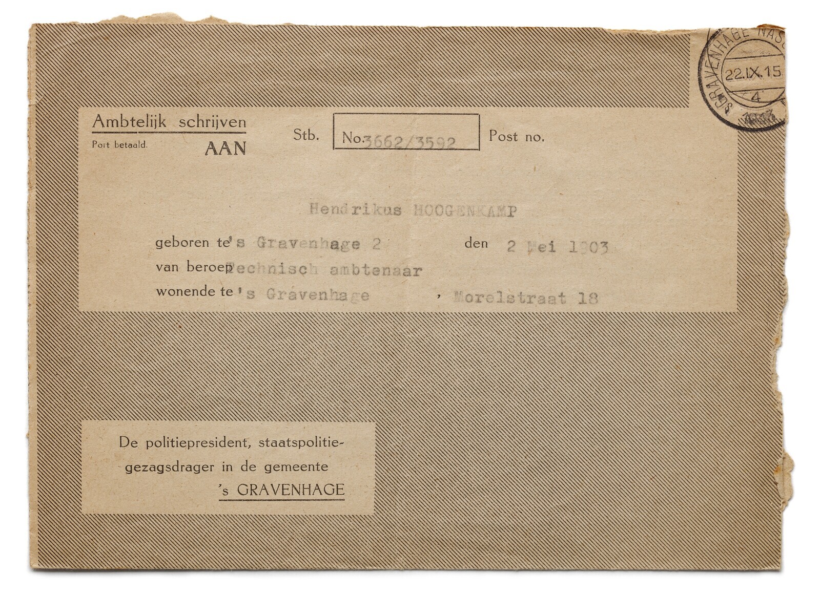 Een voorgedrukte en door typewerk ingevulde brief van: "De politiepresident, staatspolitiegezagsdrager in de gemeente 's Gravenhage" gericht aan: "Hendrikus Hoogenkamp geboren te 's Gravenhage den 2 mei 1903 van beroep technisch ambtenaar wonende te 's Gravenhage, Morelstraat 18" met een strafbeschikking. Een boete van vijf gulden of bij niet betaling een hechtenis voor de duur van twee dagen wordt opgelegd voor het niet voldoende verduisteren van een raam op de beneden verdieping aan de achterzijde van het pand Morelstraat 18.