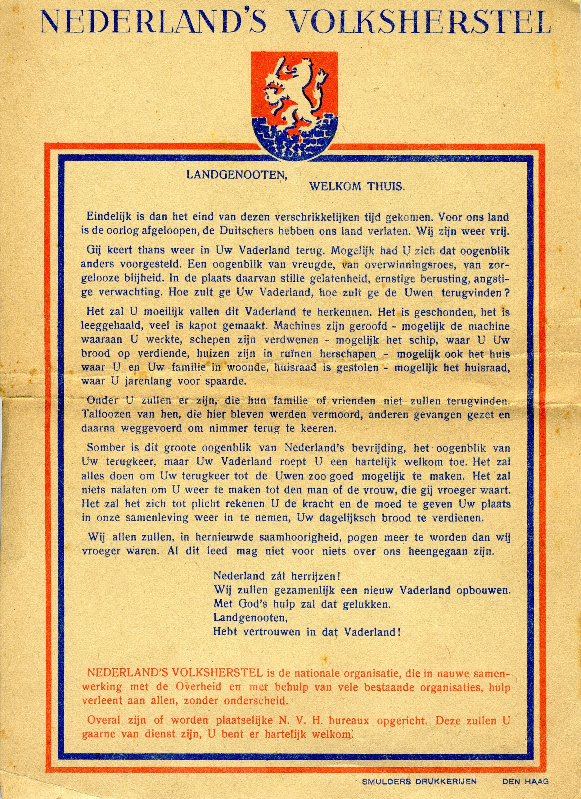 Een in rood en blauw gedrukt pamflet met bovenaan: "Nederlands' Volksherstel" en een wapenschild met de klimmende Nederlandse Leeuw staand op een geruïneerde muur. In het pamflet staat dat het Nederlands' Volksherstel als nationale organisatie in samenwerking met de overheid en andere organisaties hulp kan bieden bij de wederopbouw na de oorlog en dat iedereen welkom is bij de bureaus van het 'N.V.H.'