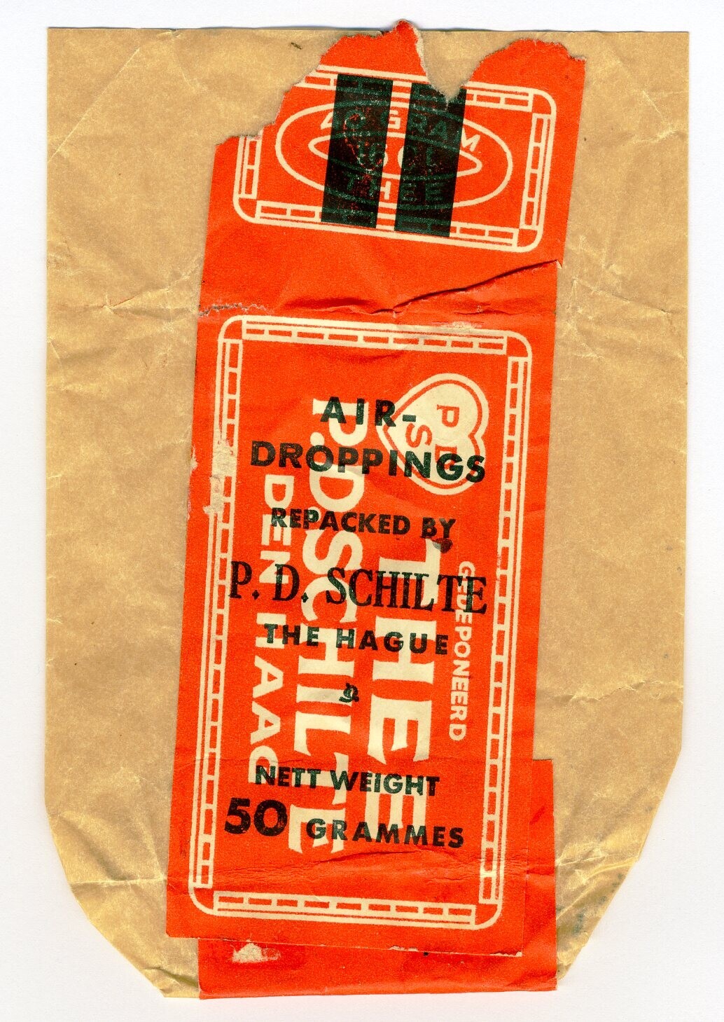 Een leeg theezakje met op het etiket: "Air-droppings repacked by P.D. Schilte The Hague Nett Weight 50 grammes".