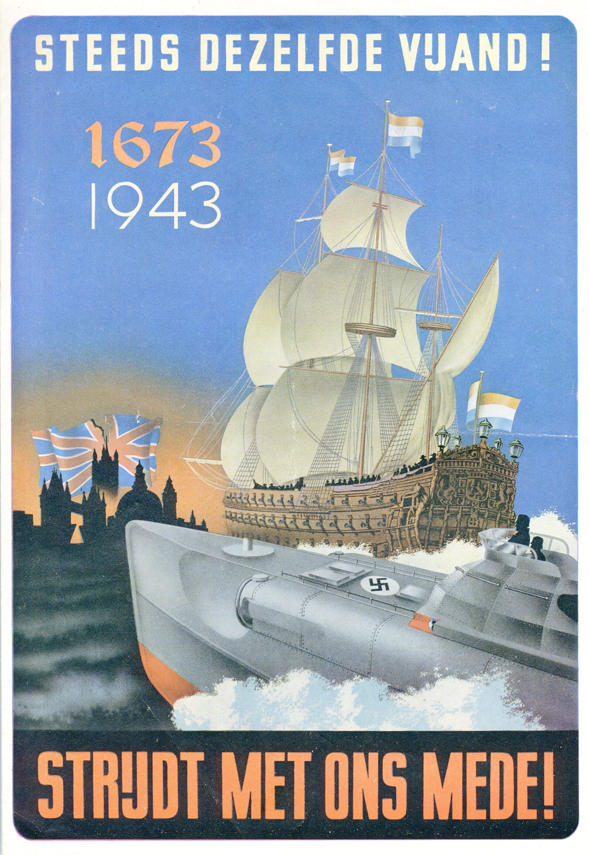 Een gedrukte folder met een afbeelding van een zeventiende eeuws oorlogsschip onder Nederlandse vlag met daarnaast een duikboot met swastika varend richting het silhouet van Londen met daarachter een gescheurde Engelse vlag. De begeleidende tekst luidt: "1673 1943 Steeds dezelfde vijand! Strijdt met ons mee!