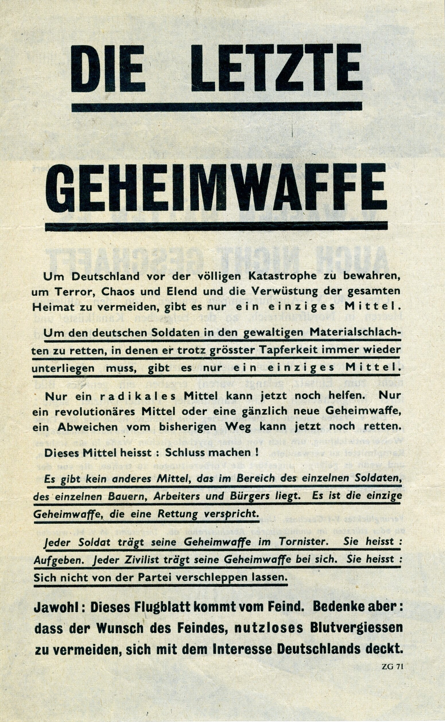 Twee exemplaren van een gedrukt pamflet met kop: "Die letzte Geheimwaffe" waarin wordt gewezen dat met de V-1 raketten de oorlog niet kan worden gewonnen en de Duitse soldaten opgeroepen worden zich over te geven aan de Geallieerden om verder bloedvergieten te voorkomen.