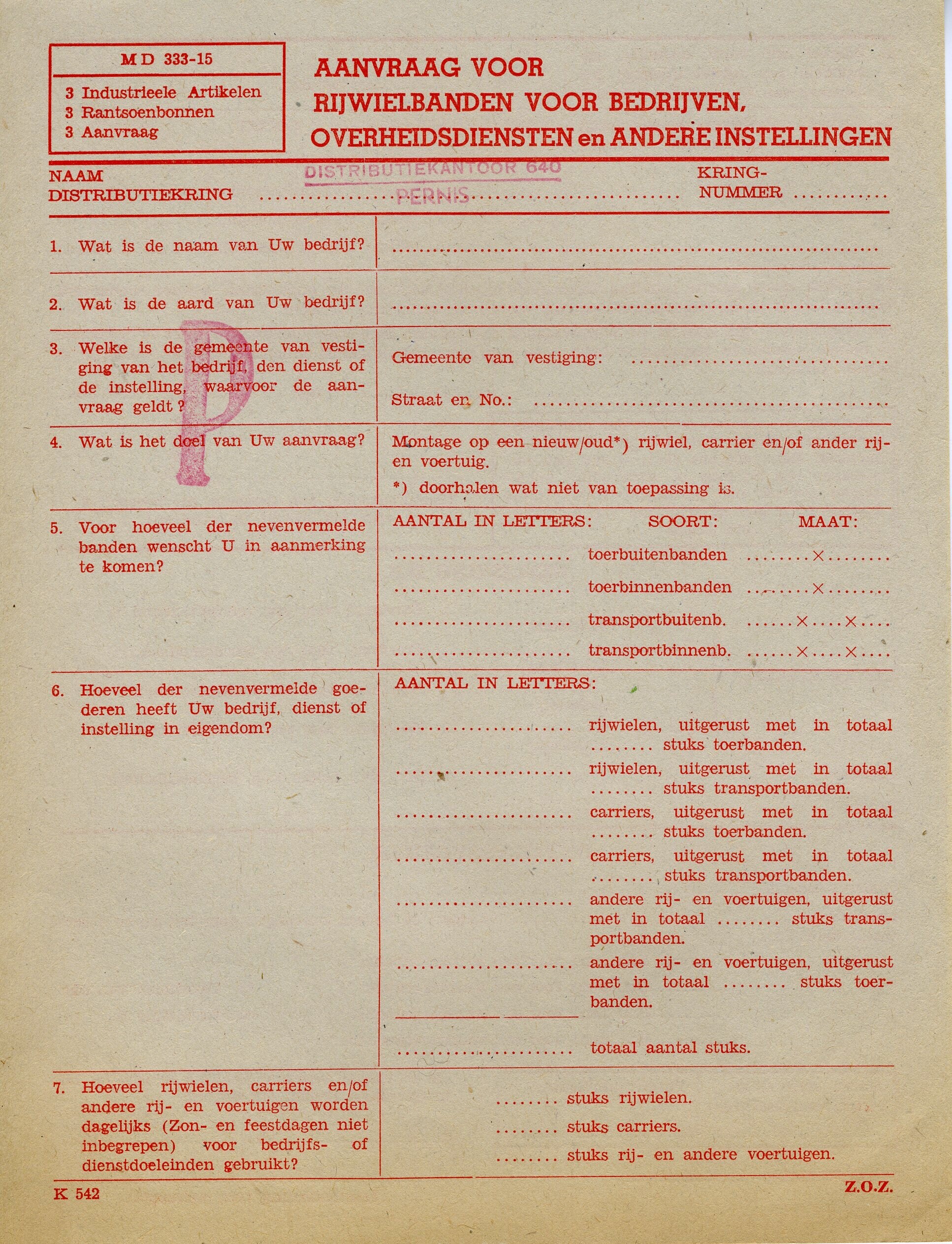 Vijf verschillende blanco formulieren die verband houden met het aanvragen van een (toer-, transport-) rijwiel, rijwielbanden of een carrier. Het betreft de formulieren MD 333-15 en MD 333-06 (rood) en de formulieren MD 122 en MD 123 (zwart). Een van de formulieren is gestempeld door Distributiekantoor 640 te Pernis. De formulieren zijn uitgegeven door de Distributiedienst. Op de achterkant is een ontvangstbewijs gedrukt. Van de formulieren MD 122 en MD 123 zijn twee exemplaren aanwezig.<br>Een machtiging met ontvangstbevestiging voor een toerbuiten of toerbinnenband.
