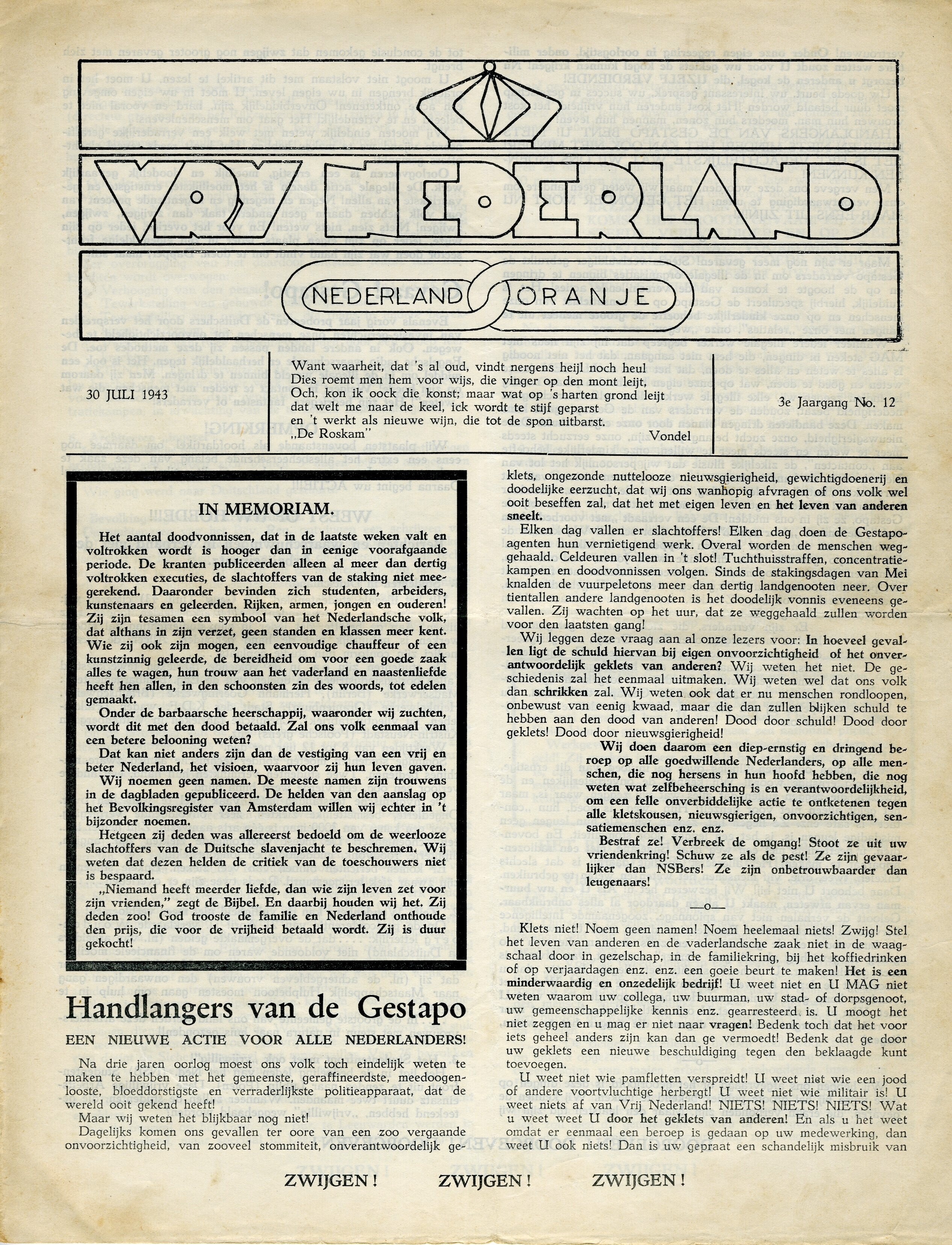 Zes exemplaren van "Vrij Nederland". Het betreft nummer 12 van jaargang 3 van 30 juli 1943. Van jaargang 4 de nummers 4 (6 oktober 1943), 5 (21 oktober 1943), 12 (28 mei 1944), 13 (eind mei 1944) en 14 (29 juli 1944). Nummer 4 betreft een buitengewone editie in klein formaat over de arbeidsinzet. Nummer 13 is geïllustreerde bevrijdingseditie. De edities zijn meerbladig.