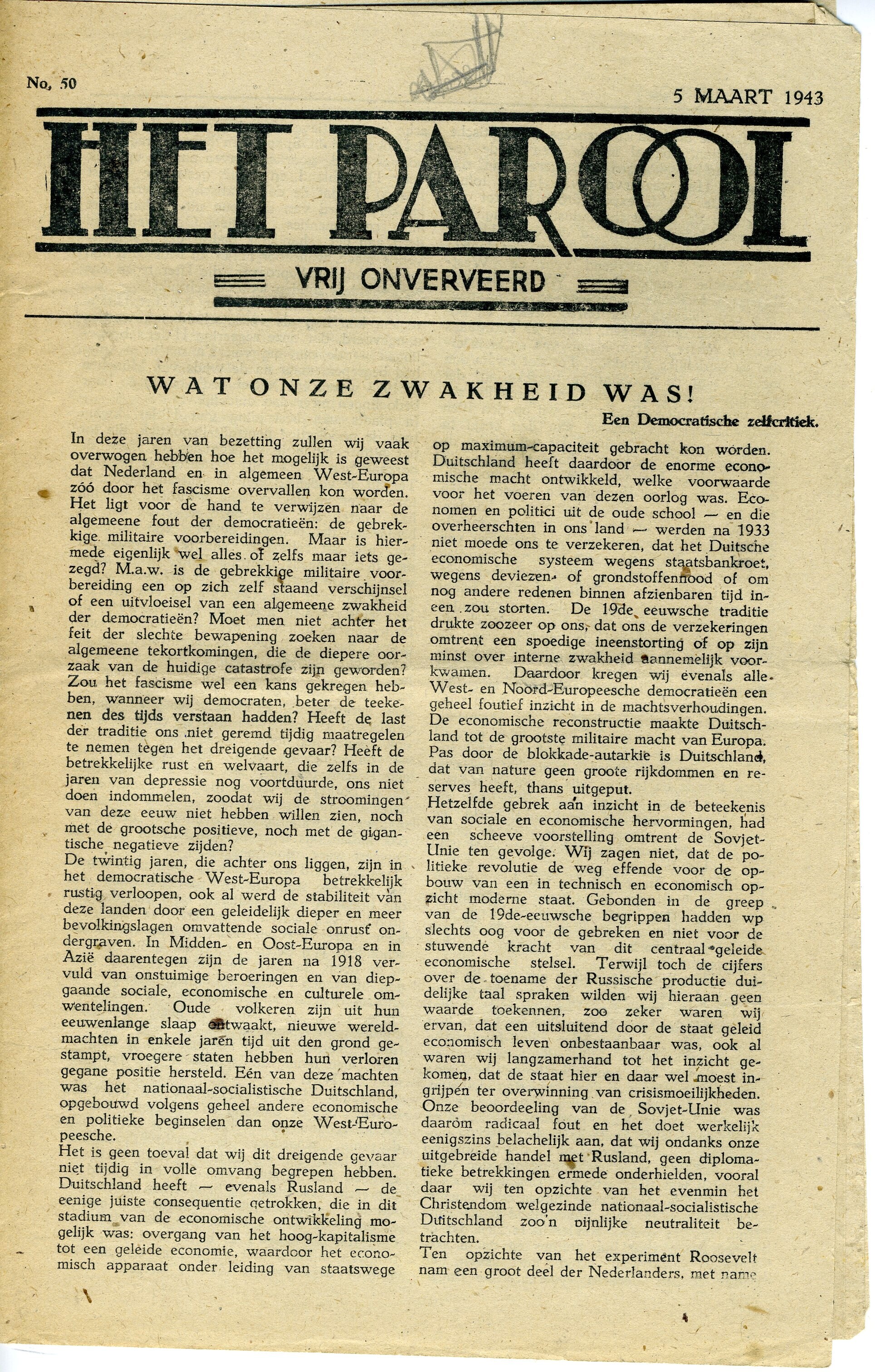 Negen exemplaren van ''Het Parool" uit de periode maart - november 1943. Het betreft de nummers 50, 51, 52, 54, 55, 56, 58, 59 en 61. En extra editie voor Rotterdam en omstreken uit 1944. De edities zijn meerbladig en verschillend in afmeting.<br>