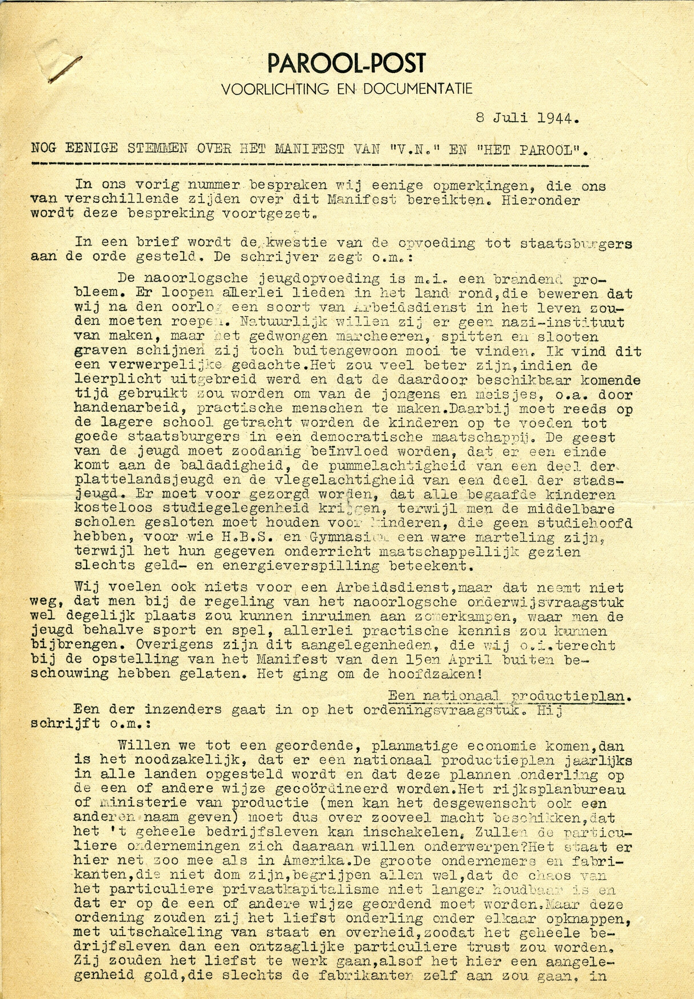 Drie getypte nieuwsberichten van ''Het Parool" waarvan een onder de titel ''Parool-post, voorlichting en documentatie'' van 8 juli 1944 met artikelen over het nieuwe Nederland na de oorlog. De twee andere nieuwsbrieven gaan over de vorderingen aan het front.