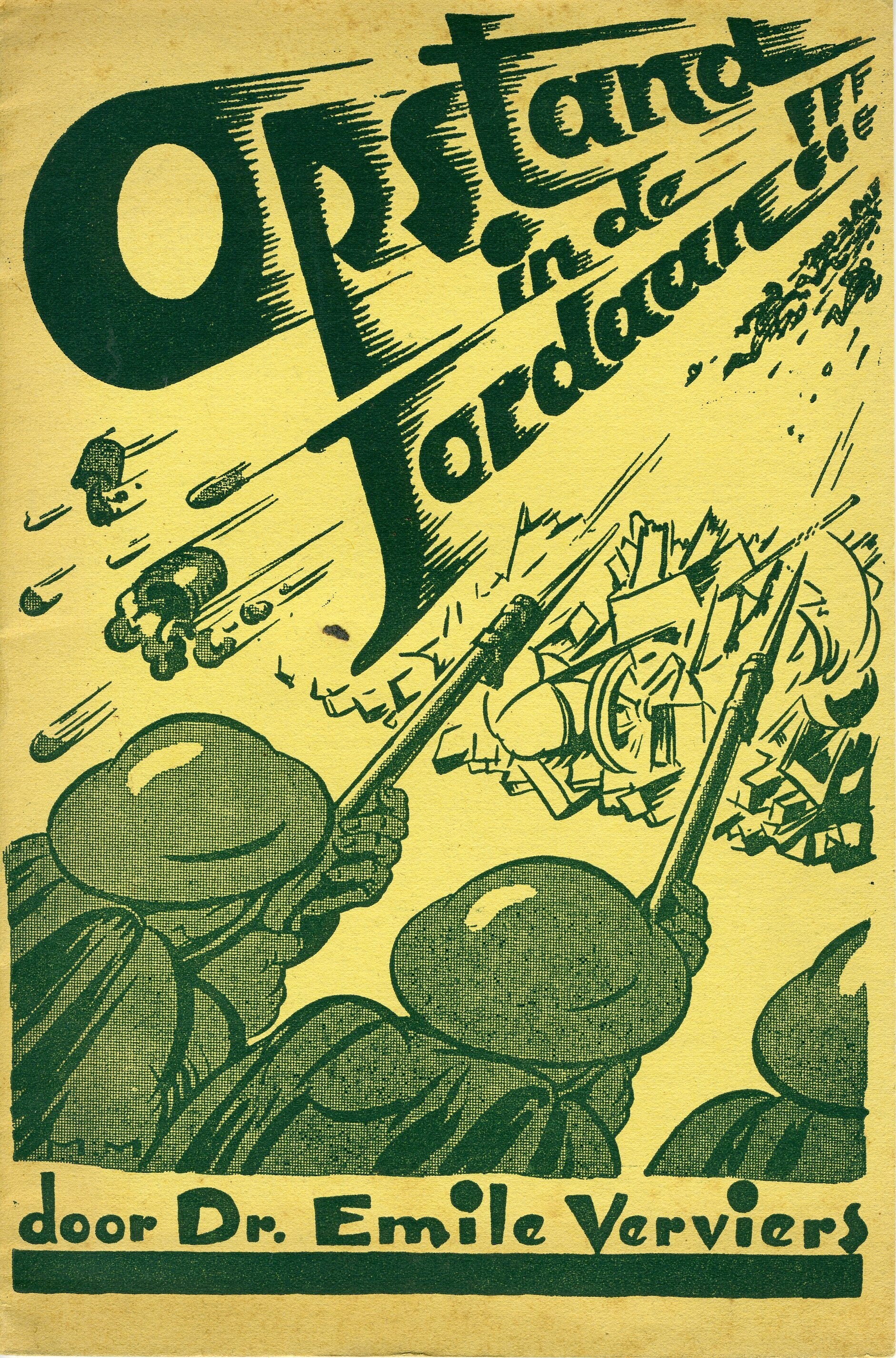 Overdruk van het artikel ''De eerste Opstand'' uit het maandblad ''Nieuw Nederland'' van augustus 1934. Het boek omvat 16 pagina's. Op de gele kaft de titel en een tekening van schietende soldaten.