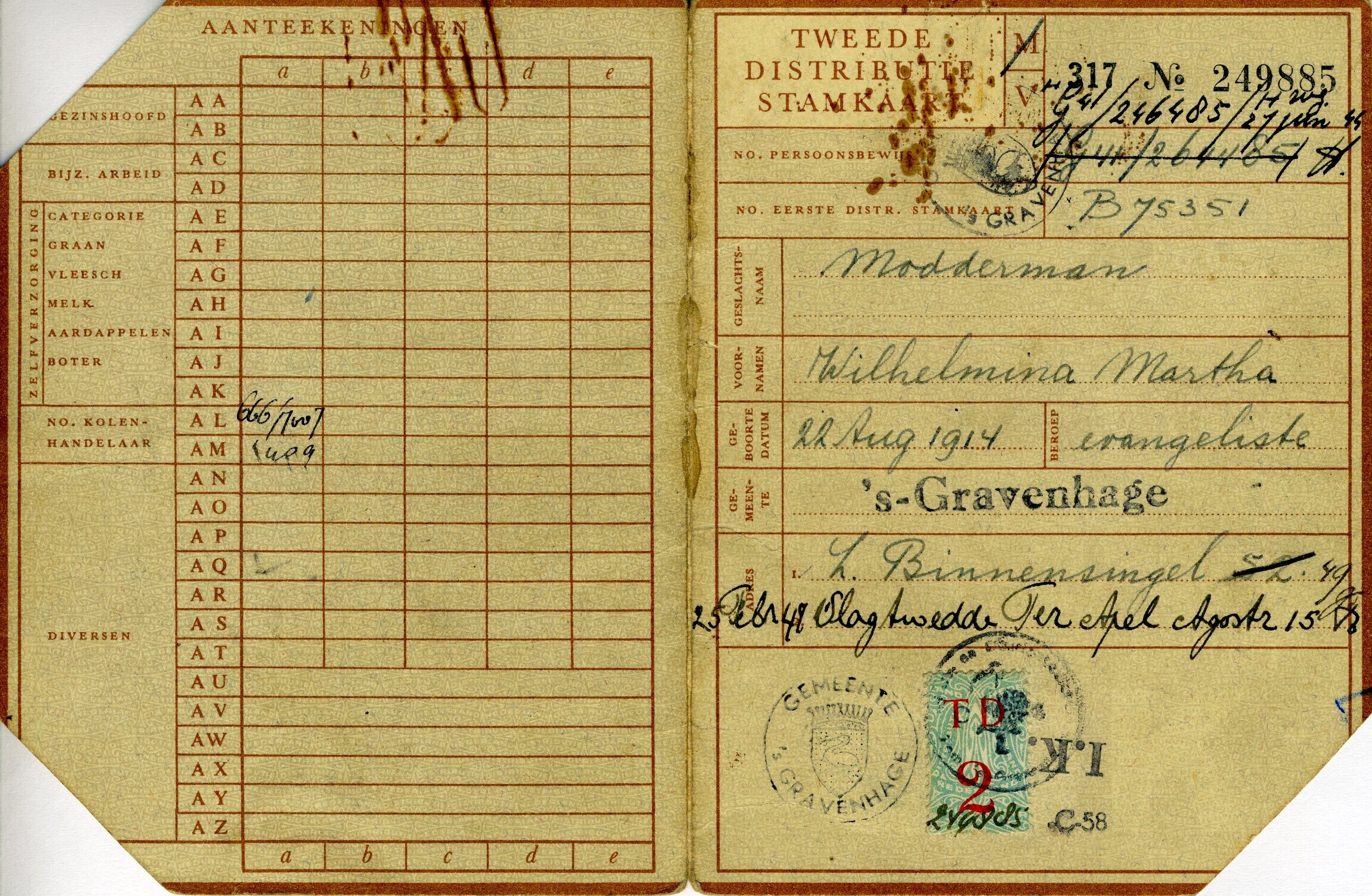 Verschillende documenten van het gezin De Vlas uit de periode van het einde van de Tweede Wereldoorlog en het jaar daarna: twee Tweede Distributie Stamkaarten uitgegeven te Den Haag op naam van mevrouw W.M. Modderman geboren op 22 augustus 1914, van beroep evangeliste en van haar op 3 september 1946 geboren zoon Jacob de Vlas; een reispas voor het traject van Heerlen naar Den Haag uitgegeven door de "Allied Expeditionary Force" met een stempel van het Militair Gezag op naam van de vader van het gezin H. de Vlas; een "Stamkaart voor de verstrekking van vitamine-D-tabletten" uitgegeven door de gemeente Den Haag op naam van Jacob de Vlas met een inlegvel voor de op 6 februari 1948 geboren Sake Pieter de Vlas. Op de achterkant van de stamkaart staat o.a.: "Voor verstrekking van Vitamine-D-tabletten komen alle kinderen in aanmerking, die ten minste drie maanden oud zijn en nog geen drie jaar zijn.........Het gebruik van vitamine-D-tabletten geeft beschutting tegen Rachitis".