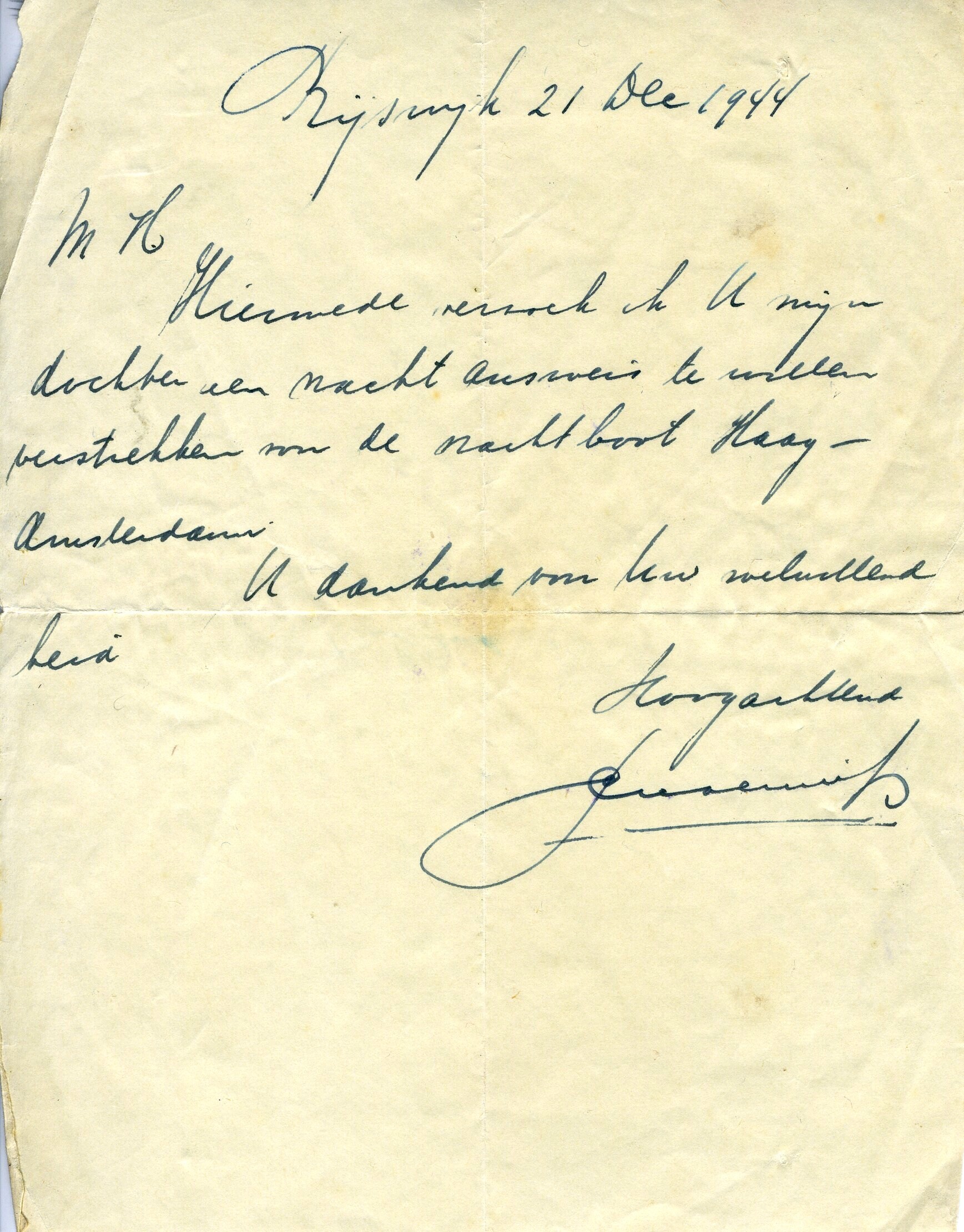 Vier documenten gerelateerd aan werk en dienstreizen: een met pen geschreven brief gedateerd: "Rijswijk 21 Dec. 1944" waarin verzocht wordt "mijn dochter een nacht Ausweis te willen verstrekken"; een oningevulde in het Duits opgestelde reispas; een in het Duits en Nederlands gestelde vergunning afgegeven te Den Haag op 21 december 1944 op naam van Helena Schaling, waarin het haar is toegestaan zich op straat te begeven tussen 20.00 uur en 04.00 uur in Zuid- en Noord-Holland in het kader van haar werkzaamheden; een werkgeversverklaring afgegeven door "De "Assumij" van 1896 N.V. 's-Gravenhage" voor "Mejuffrouw H. Schaling" op 22 maart 1945.