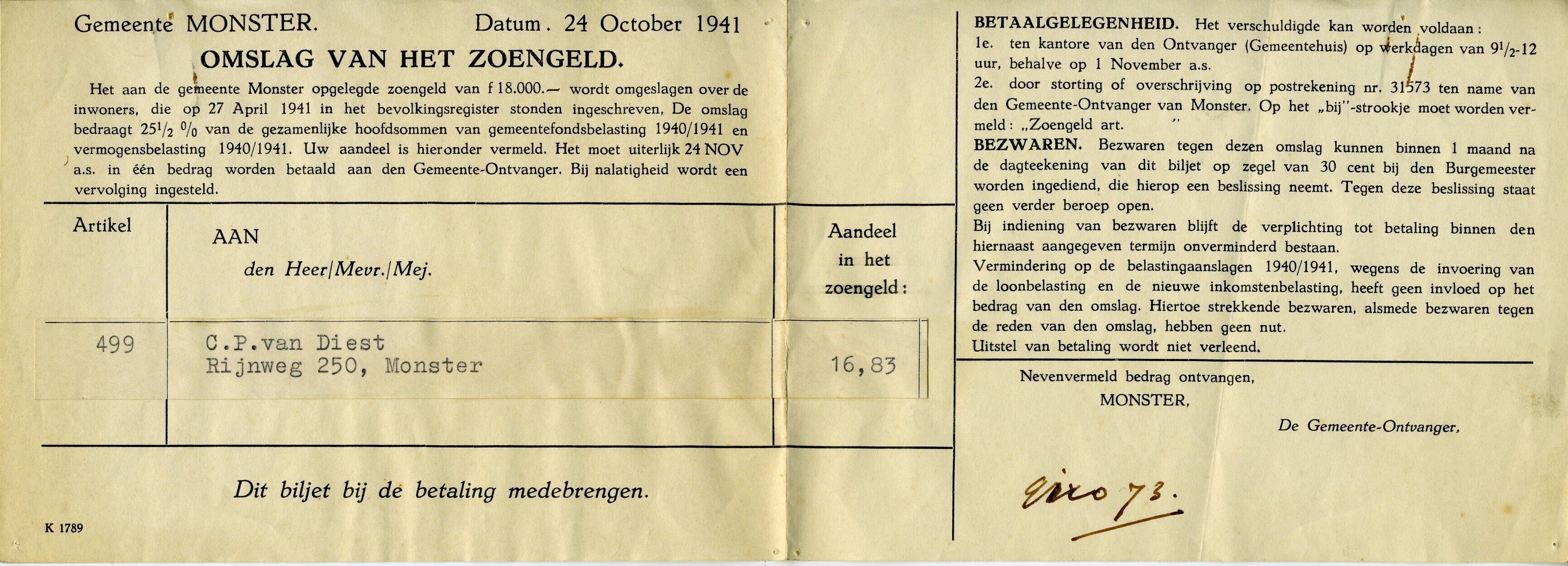 Een schrijven van de gemeente Monster waarin een aan de gemeente opgelegd bedrag aan schadevergoeding (zoengeld) van 18.000 gulden omgeslagen wordt over de inwoners van de gemeente. Dit schrijven is tevens een kwitantie waarin staat dat de desbetreffende inwoner het verschuldigde bedrag heeft betaald met girorekening 73.