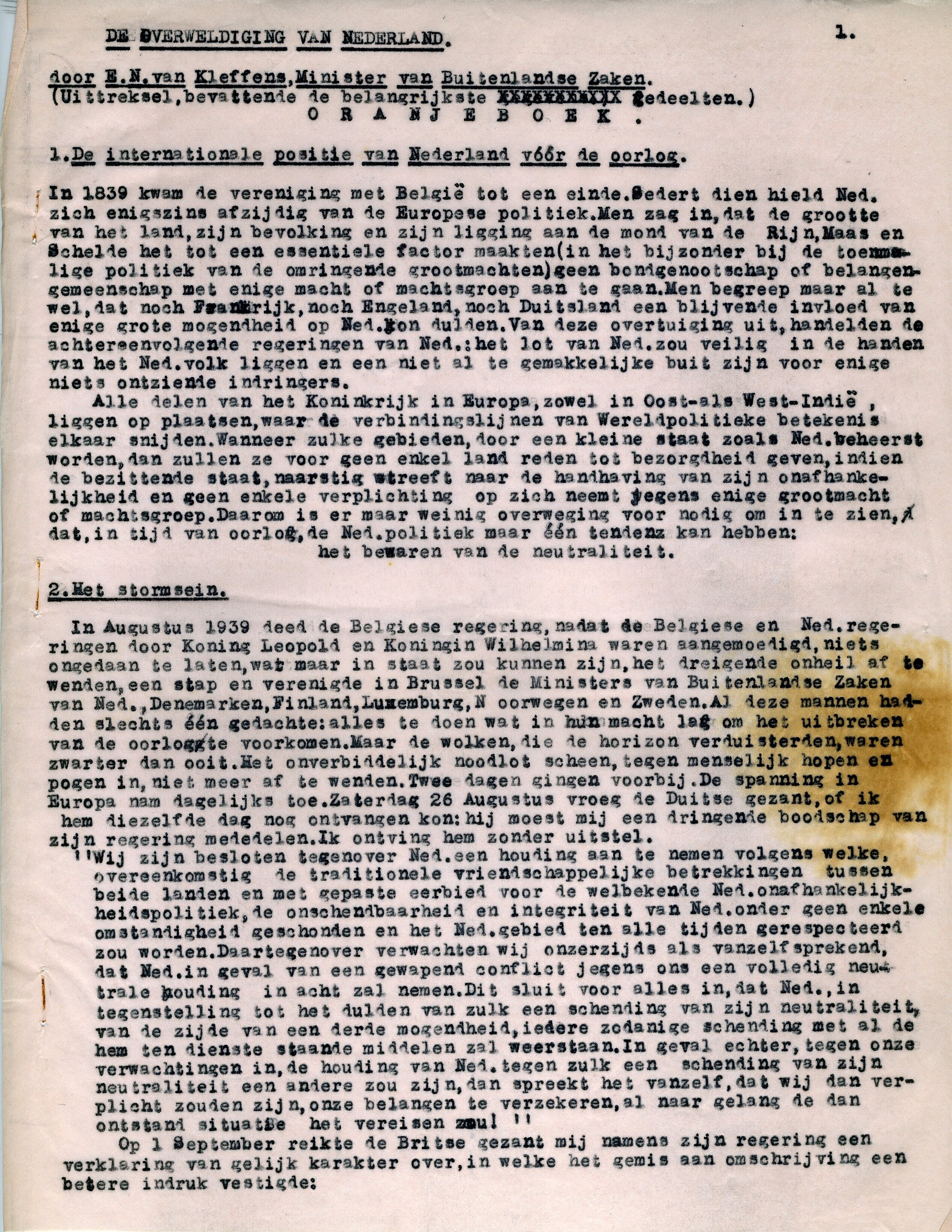 Losbladige doorslag van een getypt uittreksel van het ''Oranjeboek'' van E.N. Kleffens, minister van Buitenlandse Zaken. Het document omvat 21 losse pagina's.