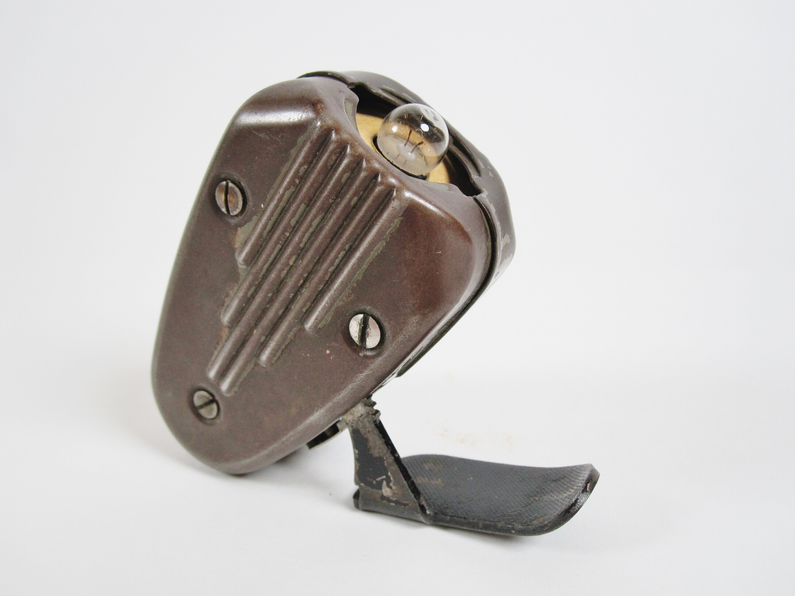 Een oorspronkelijk groen geverfde metalen knijpkat. De verf is afgesleten zodat de bruine onderlaag zichtbaar is geworden. De zwartgeverfde "voet" waarmee het lampje kan worden aangedreven komt los door een metalen schuifje aan de onderkant weg te drukken. Bovenop staat: "Made in Holland. Type 7424. Importe de Holande. 2 Volt 0 1 A". met het logo van Philips.