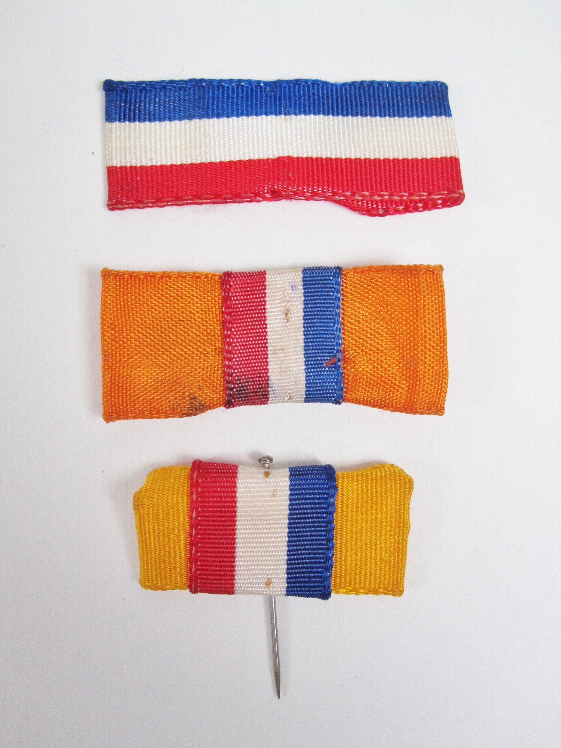 Drie zelfgemaakte speldjes waarvan één in de kleuren van de Nederlandse vlag en twee in dezelfde kleuren met toegevoegd dat van het Oranjehuis. Deze broches zijn een stil verzet tegen de Duitse bezetter.