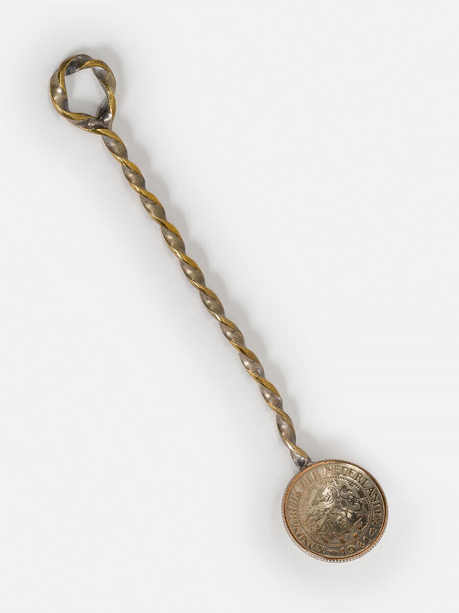 Een lepeltje met onder de messing steel een hol geslagen koperen munt van 1 cent met de afbeelding van de klimmende Nederlandse leeuw met daar omheen: Koninkrijk de Nederlanden 1941.