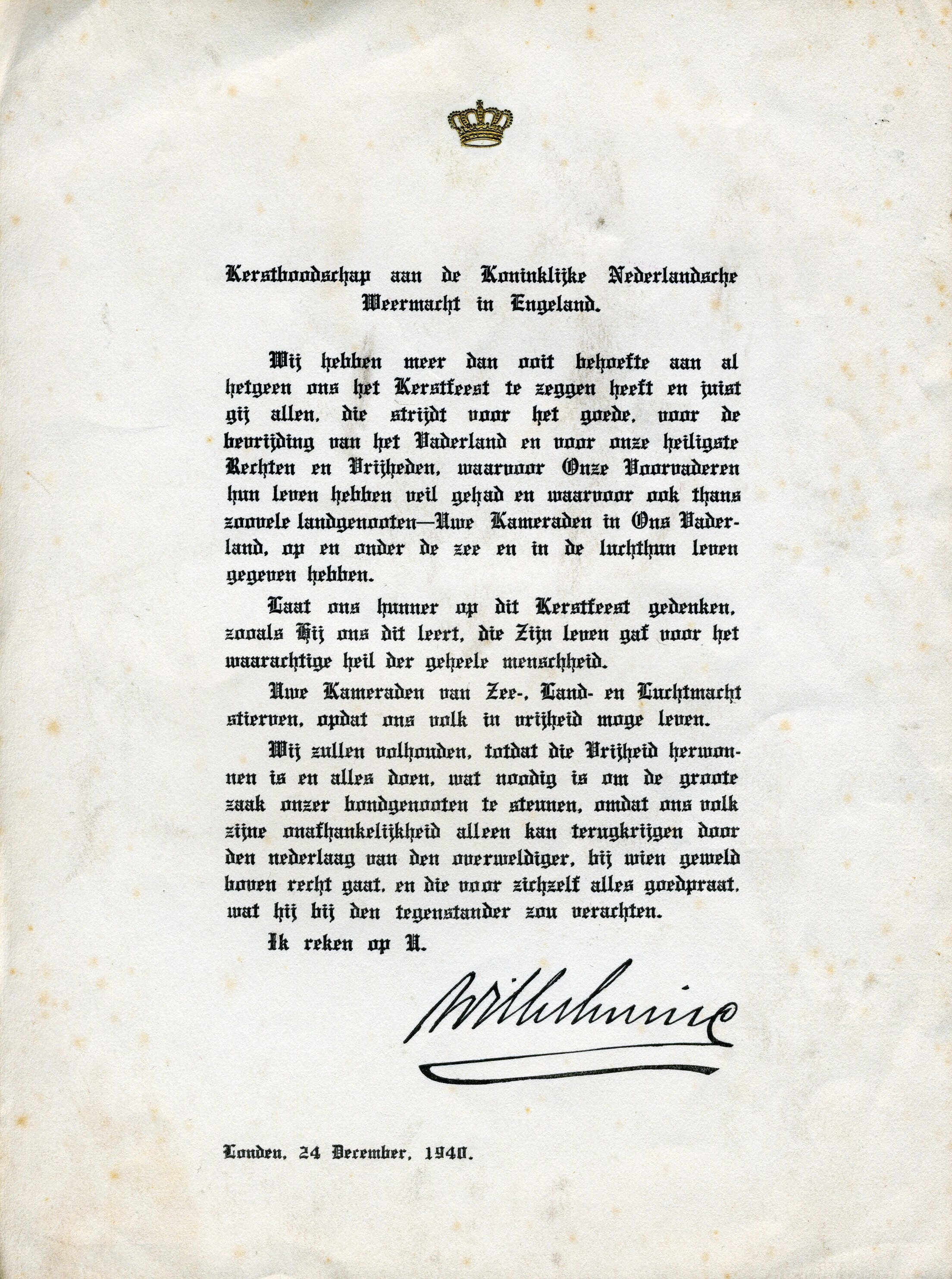 Een 'Kerstboodschap aan de Koninklijke Nederlandsche Weermacht in Engeland' van Koningin Wilhelmina gedaan te Londen op 24 december 1940. De Kerstgroet is in gotisch schrift afgedrukt op dik papier en bovenaan voorzien in een in reliëf gedrukt gouden kroontje.