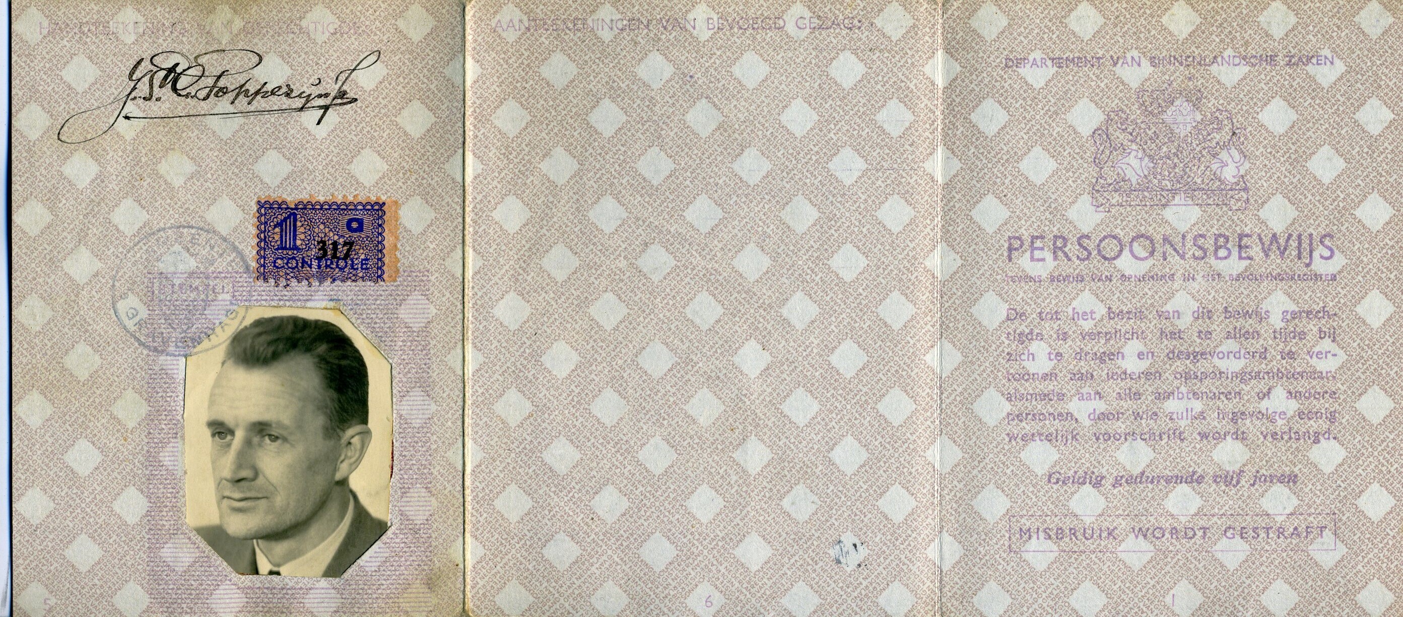 Een persoonsbewijs op naam van Johannes Steven C. Poppezijn uitgegeven te Den Haag op 25 oktober 1941 met pasfoto en vingerafdruk. Toegevoegd is een blaadje met de "Verplichtingen ten aanzien van het Persoonsbewijs". Het persoonsbewijs is gestoken in een doorzichtig kunststoffen hoesje.