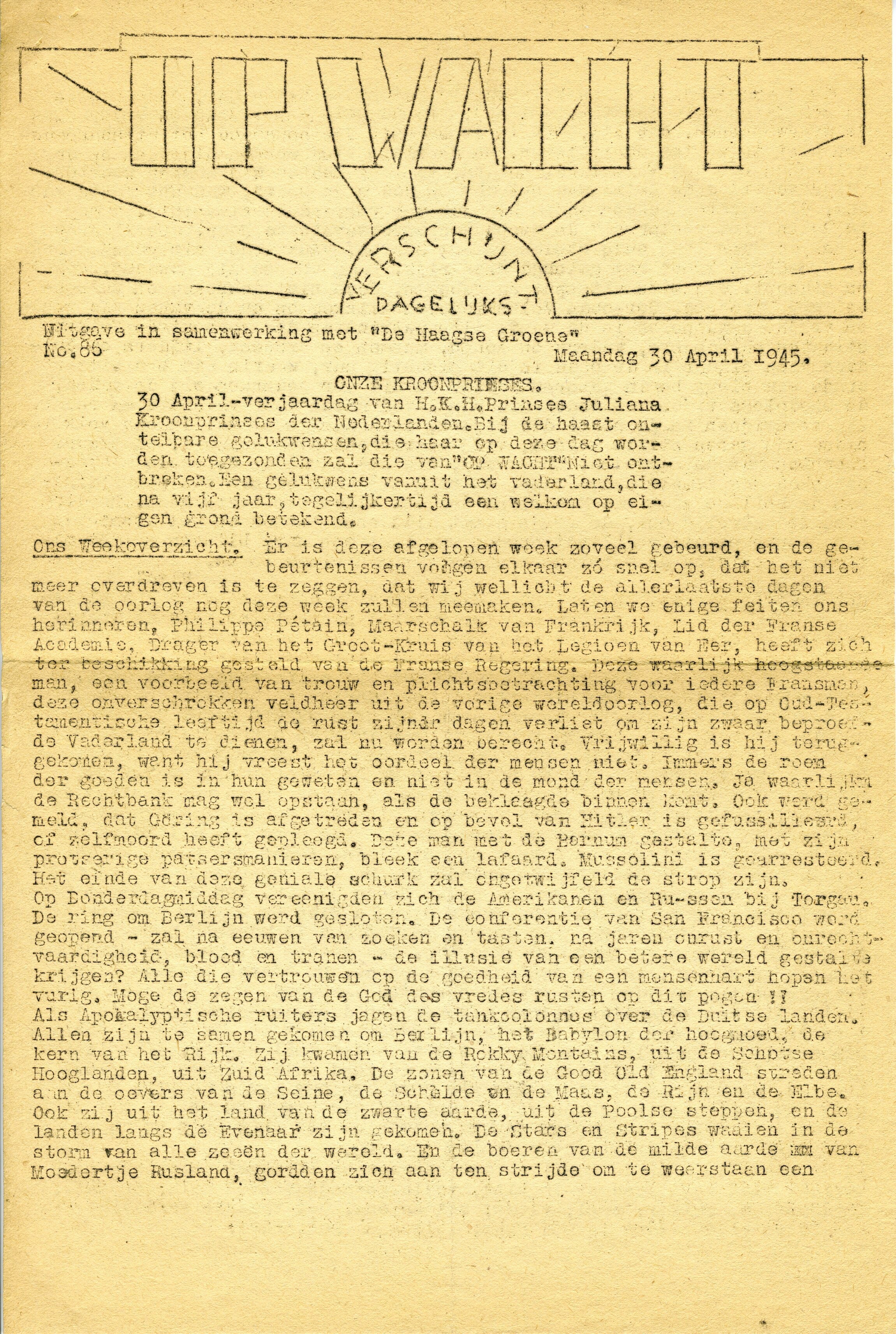 Vier exemplaren van 'Op wacht', uitgaven in samenwerking met 'Haagse Groene' voor Den Haag en omstreken. Het betreft de nummers 86 (30 april 1945), 87 (1 mei 1945), 88 (2 mei 1945) en 89 (3 mei 1945). Voorts een speciaal nieuwsbulletin van 3 mei 1945 over de verovering van Berlijn en een ongedateerde speciale uitgave van vier pagina's over Nederland en Nederlands-Indië na de bevrijding.