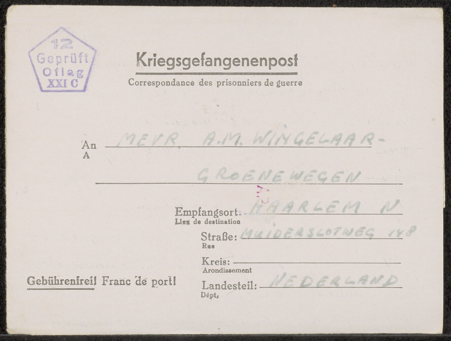 Briefwisseling tussen krijgsgevangene H.A. Wingelaar en zijn vrouw. Bovenaan "Kriegsgefangenenpost" met daaronder de adressering: "1e Luit.M.A. H.A. Wingelaar. Gefangenennummer: 7648. Lager-Bezeichnung: Kriegsgef. Offizierlager XXI C/Z Grune bei Lissa Deutschland (Duitschland) Wartheland" het huidige Leszno in Polen en het adres van zijn vrouw: "Mevr. A.M. Wingelaar-Groenewegen" te Haarlem. het gaat om 104 brieven geschreven tussen juni 1943 en december 1944. Twee brieven gedateerd: 12 februari 1945 en 26 maart 1945 met adressering: "1e Luit.M.A. H.A. Wingelaar. Gefangenennummer: 7648. Lager-Bezeichnung: Kriegsgef. Offizierlager 67 Neubrandenburg i. Meckl. Barak 18a Deutschland (Duitschland)" in de Duitse provincie Mecklenburg-Vorpommern en het adres van zijn vrouw: "Mevr. A.M. Wingelaar-Groenewegen" te Haarlem.<br>Los toegevoegd zijn een 'Merkblad' voor "Pakjes met schriftelijke mededeelingen" met een lijst van verboden voorwerpen; twee onbeschreven briefkaarten; een geadresseerde maar onbeschreven brief; een instructieblad voor het verzenden en verpakken van pakketten; een briefkaart gedateerd 18 december 1943 van H.A. Wingelaar vanuit zijn krijgsgevangenkamp te Lezno aan zijn oud-collega's bij het "Acc. Bureau A.E. Meyer en J. Hörchner" te Amsterdam; een briefkaart gedateerd 9 januari 1944 van H.A. Wingelaar vanuit zijn krijgsgevangenkamp te Leszno aan de "Dames N. van Winden en S. Minekus" te Voorst in Gelderland.