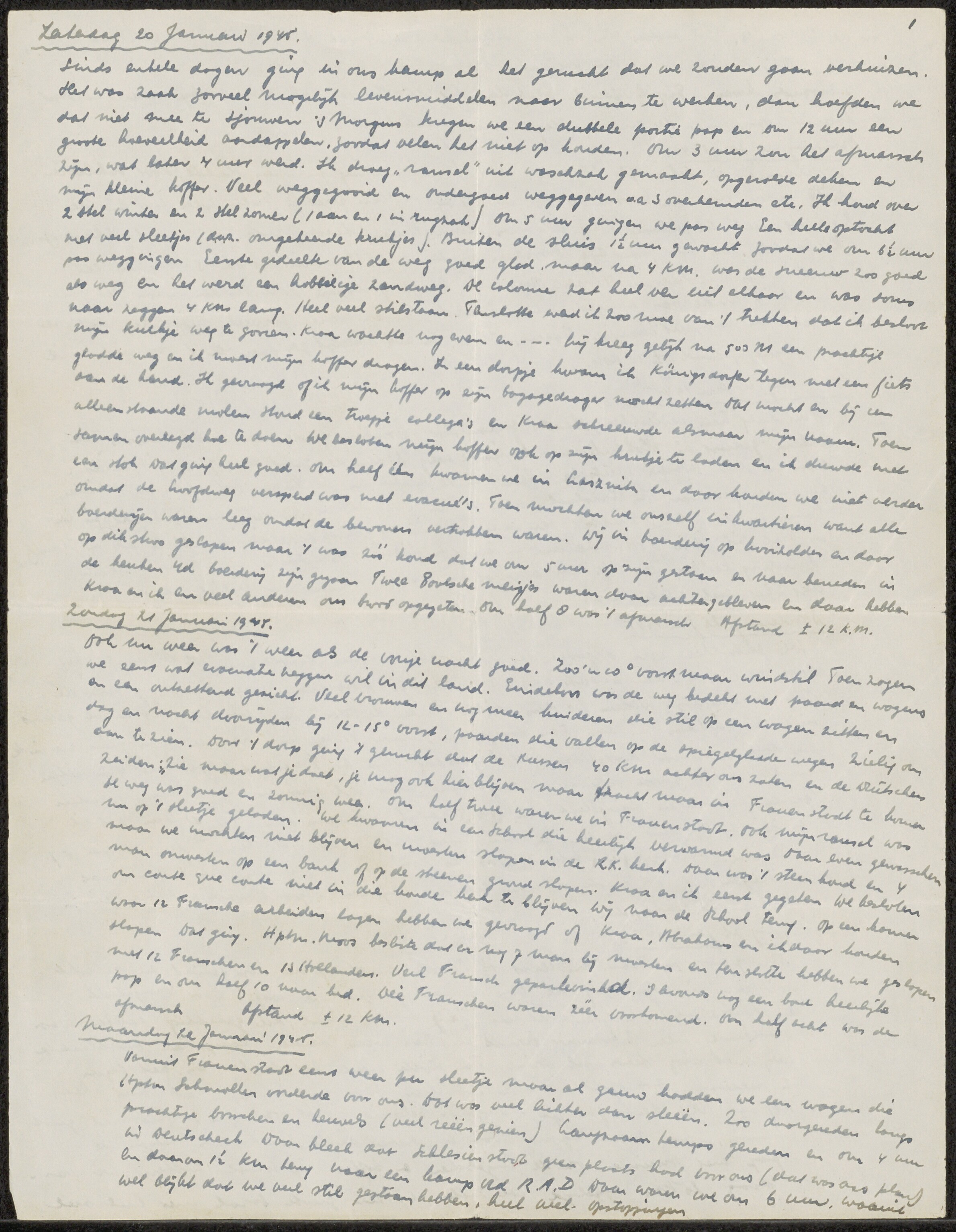 Een op drie vellen ongelinieerd papier met pen geschreven verslag van de tocht van het krijgsgevangenkamp "Grune bei Lissa" het huidige Leszno in Polen naar "Kriegsgefangenen Offizier-lager 67 Neubrandenburg" in de Duitse provincie Mecklenburg-Vorpommern van zaterdag 20 januari 1945 tot en met zaterdag 17 februari 1945 door krijgsgevangene luitenant Henk Wingelaar. Bij die tocht was ook professor Lieftink aanwezig.