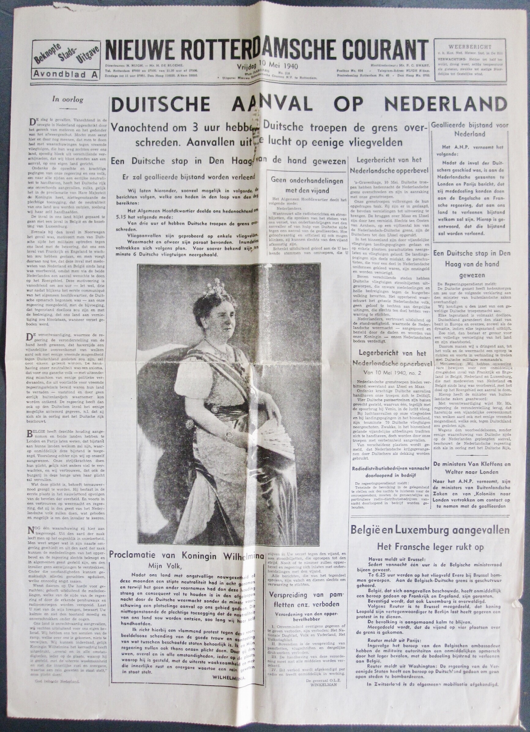 Vier kranten uit de periode april en mei 1940. Het betreft drie exemplaren van de Nieuwe Rotterdamsche Courant van dinsdag 2 april, zaterdag 6 april en vrijdag 10 mei 1940. Een exemplaar van de Telegraaf van 10 mei 1940. In de edities van 10 mei een hoofdartikel over de Duitse aanval op Nederland en een proclamatie van koningin Wilhelmina.