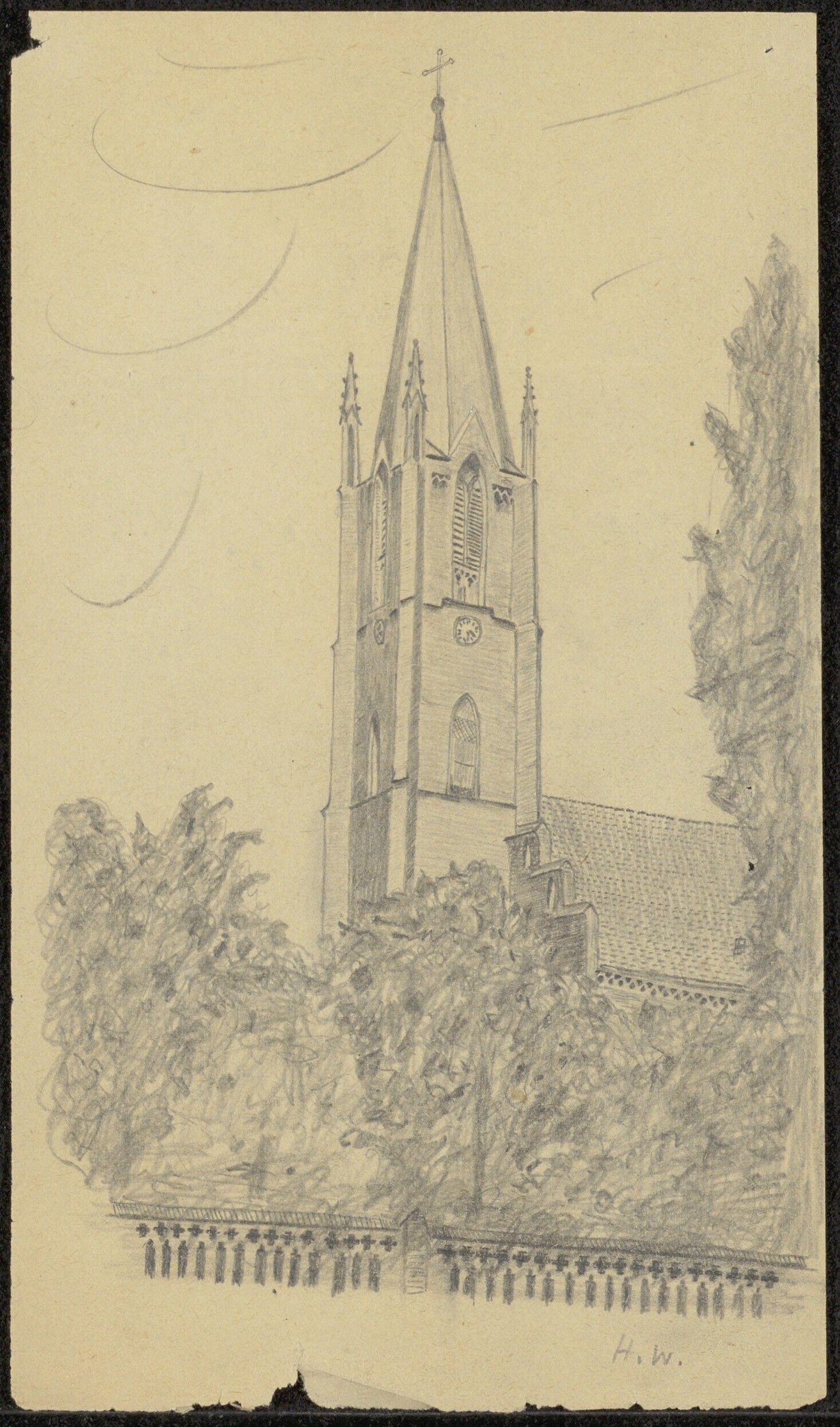 Een potloodtekening van de Mariakerk (Marienkirche) te Neubrandenburg vervaardigd door krijgsgevangene luitenant Henk Wingelaar. Rechtsonder: "H.W."