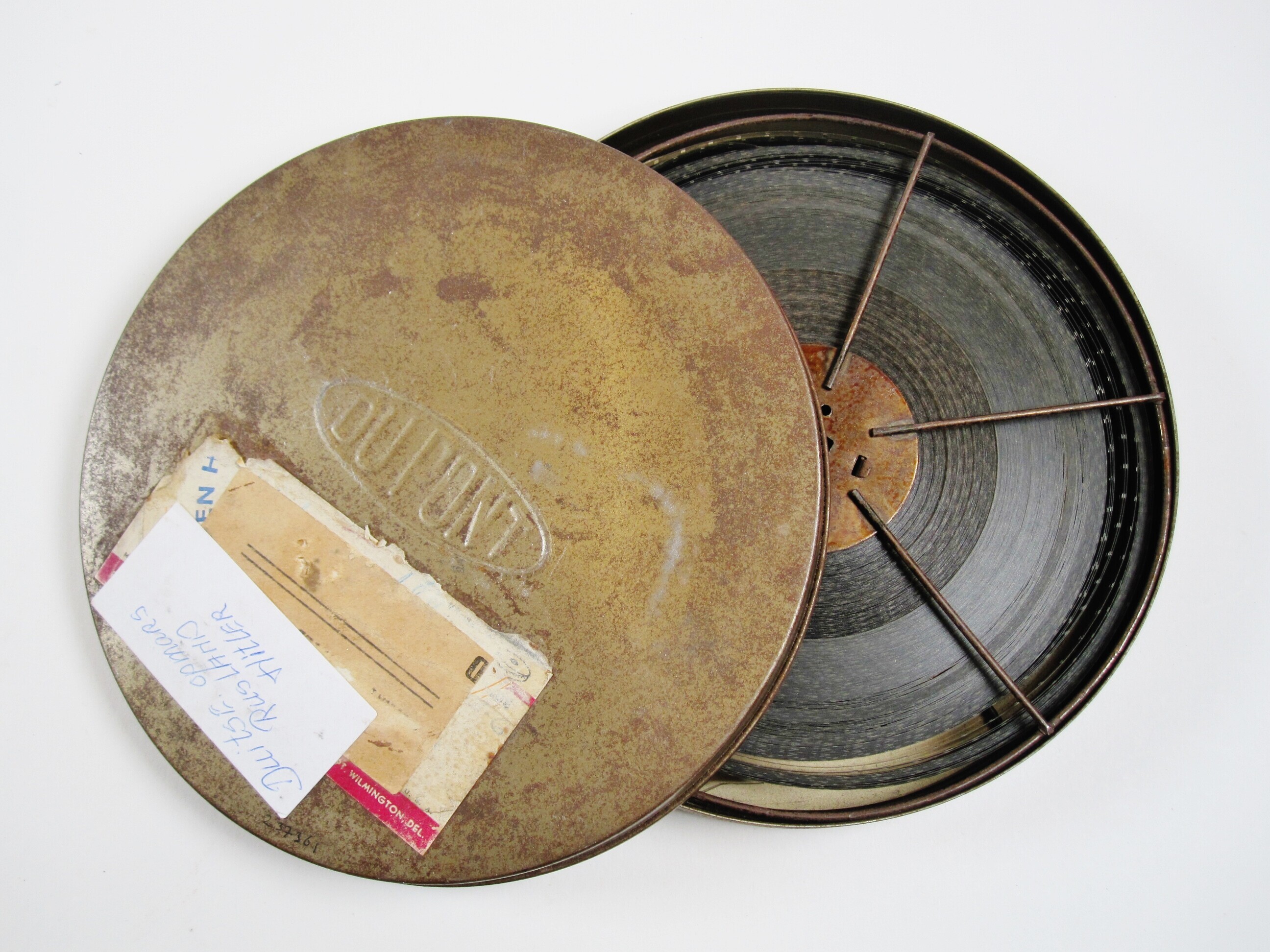 Een Duitse propagandafilm in zwartwit van de Duitse opmars in Rusland in 1942 op een metalen spoel in een filmblik met daarin gestanst: Dupont.