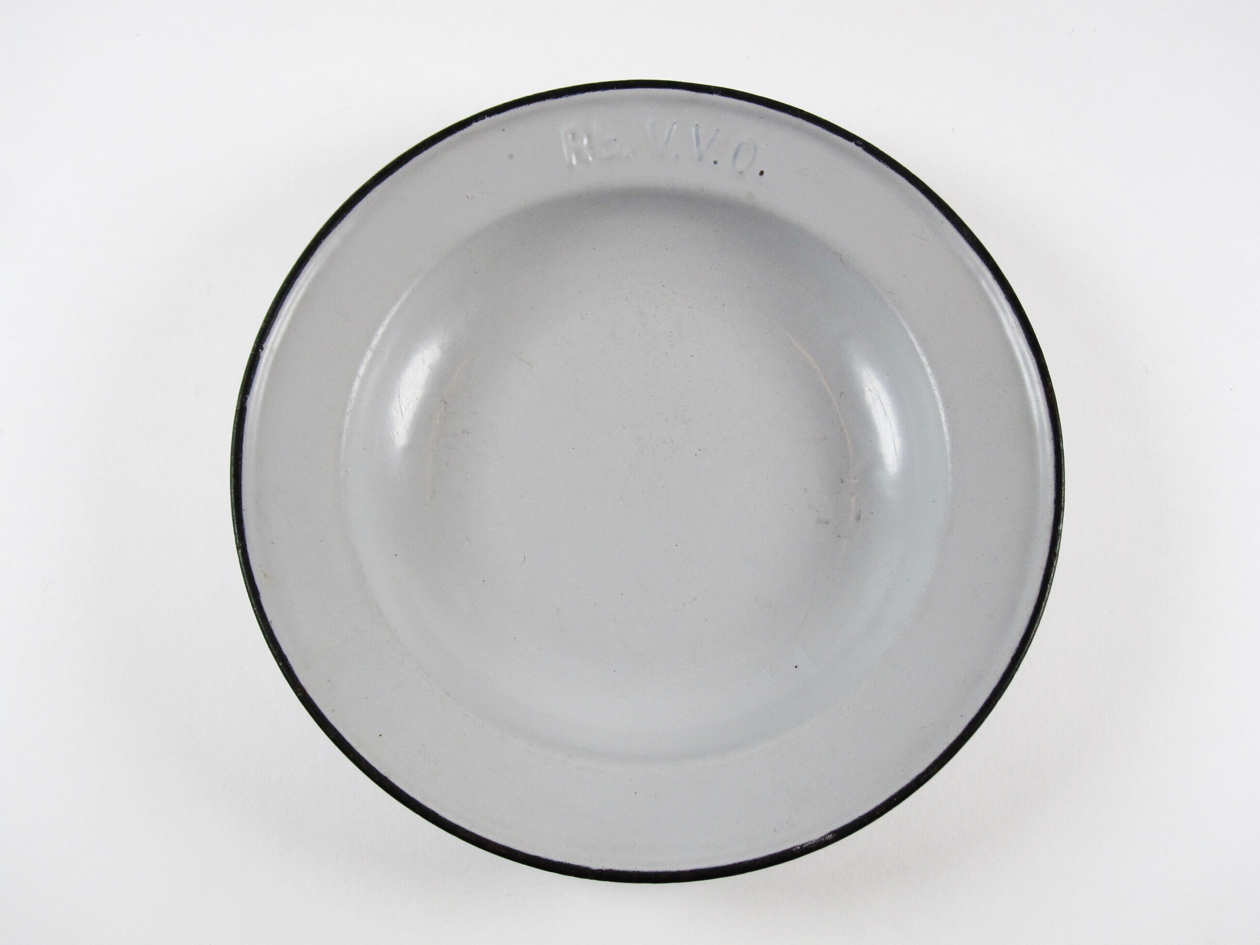 Een grijs geëmailleerd ijzeren bord met daarin gestanst de letters "Rb. V.V.O." (Rijksbureau voor Voedselvoorziening in Oorlogstijd). Het bord werd gebruikt in de gaarkeuken te Den Haag, waar Aleida Maria van Egmond-Rozestraaten werkzaam was.