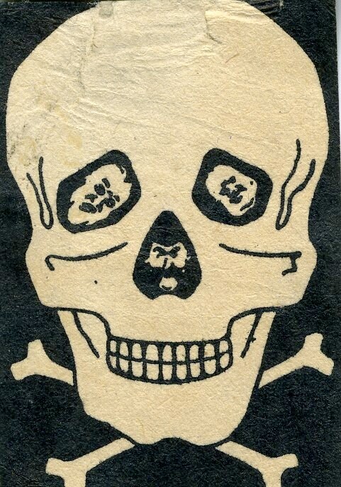 Een wit pamfletje met in zwarte opdruk een doodskop met in de ogen de portretten van Churchill en Roosevelt en in het neusgat het portret van Stalin.