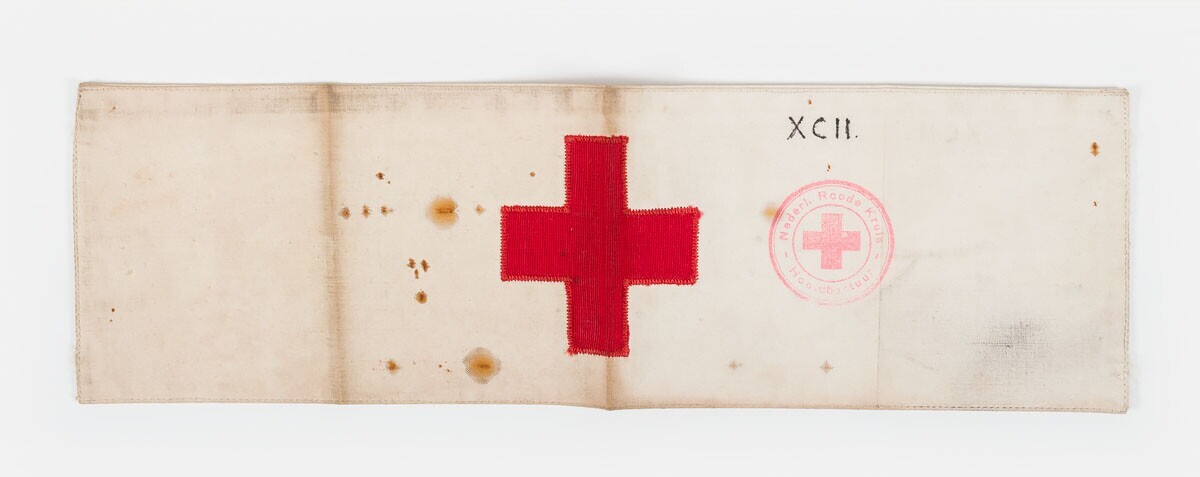 Een wit katoenen mouwband met het logo van het Rode Kruis en een rood stempel met: "Nederl. Roode Kruis Hoofdbestuur". De mouwband is gedragen door de heer A.J.H. Graas.