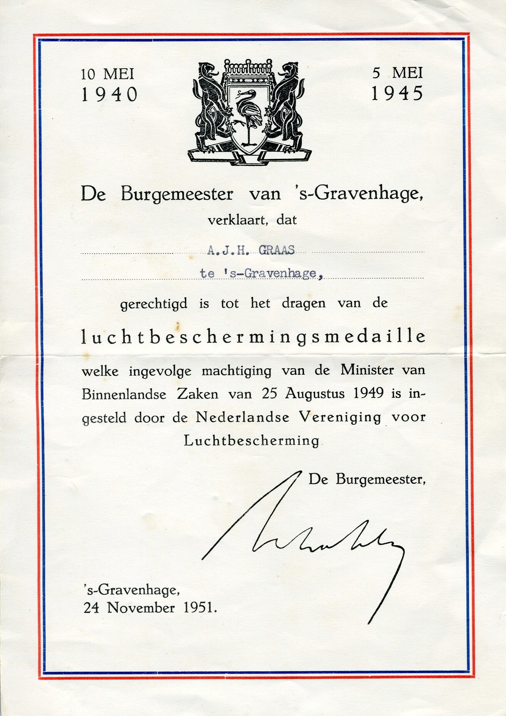 Een oorkonde met bovenaan het wapen van Den Haag tussen de jaartallen 10 mei 1940 en 5 mei 1945. In de oorkonde verklaart "De Burgemeester van 's-Gravenhage" dat "A.J.H. Graas te 's-Gravenhage, gerechtigd is tot het dragen van de luchtbeschermingsmedaille".