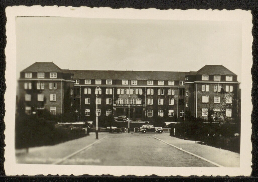 Vijf zwartwit foto's van de afbraak voor de Atlantikwall van het Rode Kruis ziekenhuis: een foto genummerd 72 (Ziekenhuis nog intact): geen datum, fotograaf onbekend; een foto genummerd 32: 30 januari 1943 (in potlood op de achterkant: De operatiezaal v/h Rode Kruis Ziekenhuis op de Sportlaan), initialen: AvV (A. van Vliet); een foto genummerd 33, 30 januari 1943 (in potlood op de achterkant: De achterzijde v/h Rode Kruis Ziekenhuis), initialen: AvV (A. van Vliet); een foto genummerd 49, 3 februari 1943 (in potlood op de achterkant: Het mooie Rode Kruis Ziekenhuis op de Sportlaan), initialen: AvV (A. van Vliet); een foto genummerd 43: geen datum, fotograaf onbekend.