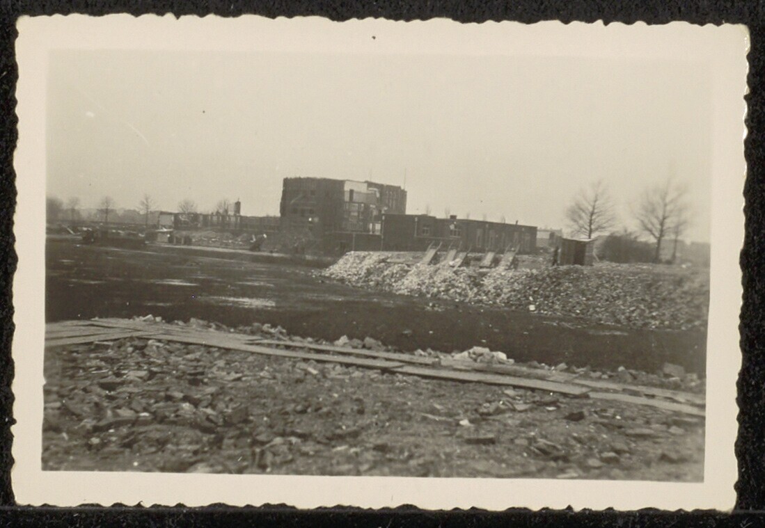 Een zwartwit foto van de afbraak voor de Atlantikwall van het Eerste Gemeentelijk Lyceum: nr. 18: 12 januari 1943, fotograaf onbekend.