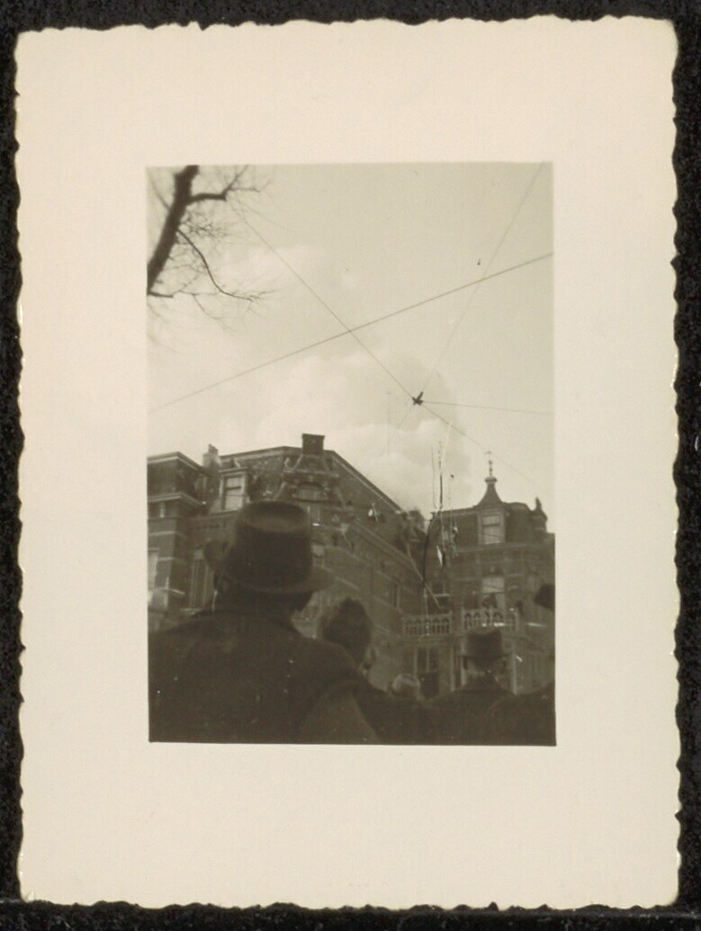Twee zwartwit foto's van rookontwikkeling na sabotage: beide foto's zijn genummerd 5 en gedateerd: 8 januari 1943, initialen: AvV (A. van Vliet). Op de achterkant van één van de foto's, waar mensen opkijken naar de rook, staat met potlood: "Sabotage". Een der 4 branden die in één middagpauze woedde. Hoek Sweelinckstr. - Gr. Hertoginnelaan."