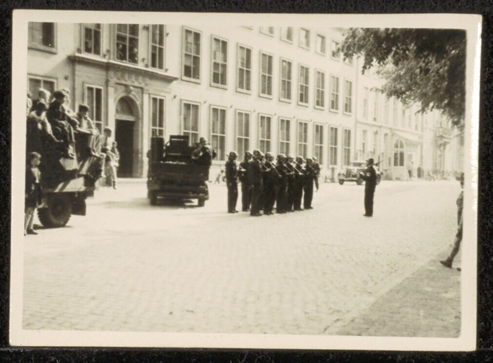 Een zwartwit foto van een groep Binnenlandse Strijdkrachten op Lange Voorhout, een jeep en een ander legervoertuig waar kinderen op zitten: ongenummerd, geen datum, fotograaf onbekend.