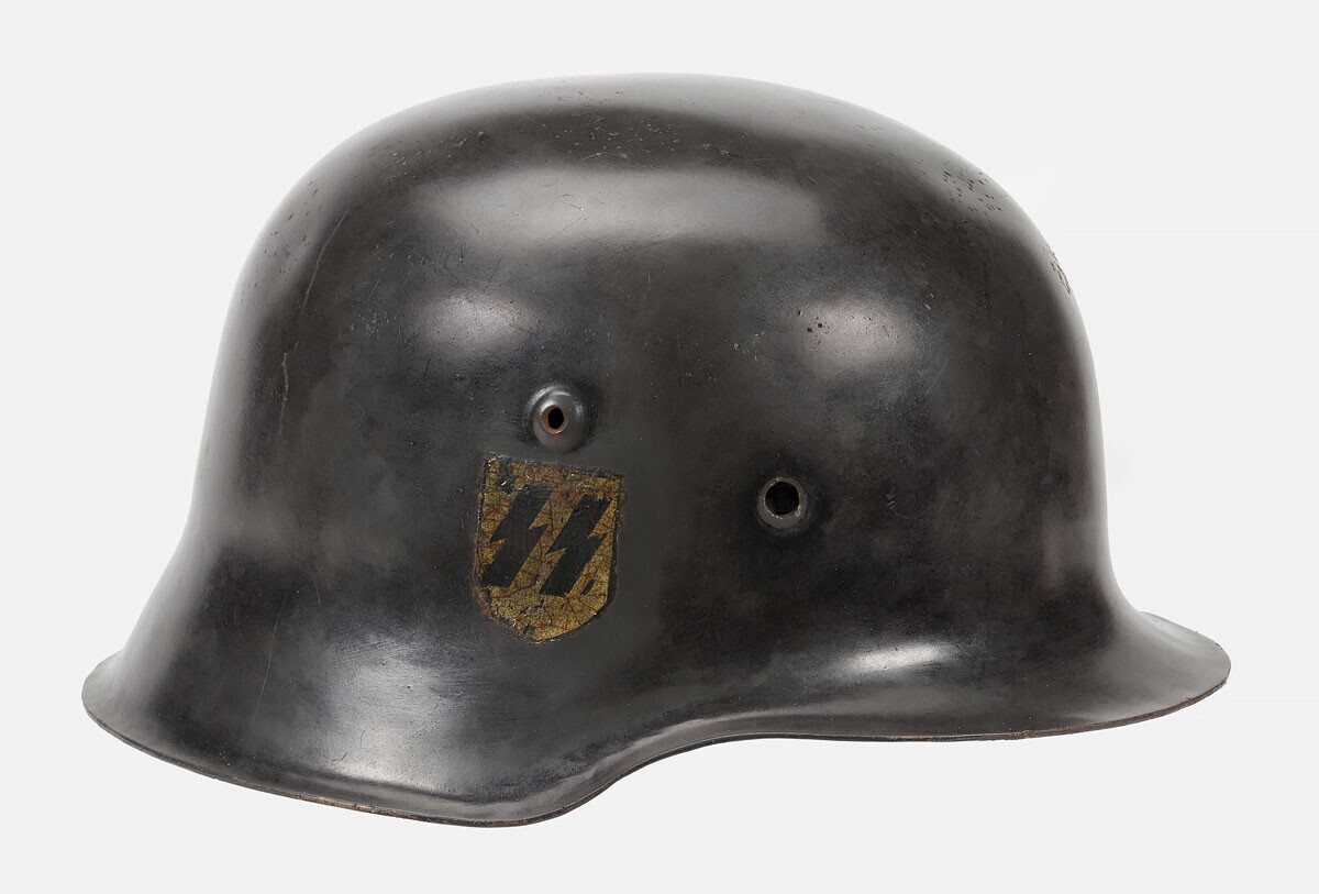 Een Stahlhelm met lederen binnenwerk maar zonder kinband. Op de binnenkant staat een stempel met: "(A)bgenommen (..?..) II 1942 (..?..)affungsambt (..?..)nd" en de in het metaal gestanste nummers: "2407" en "ET-68". Op de buitenkant ontbreekt een schroef. Op de rechter buitenkant is het logo van de SS (Schutzstaffel) aangebracht.