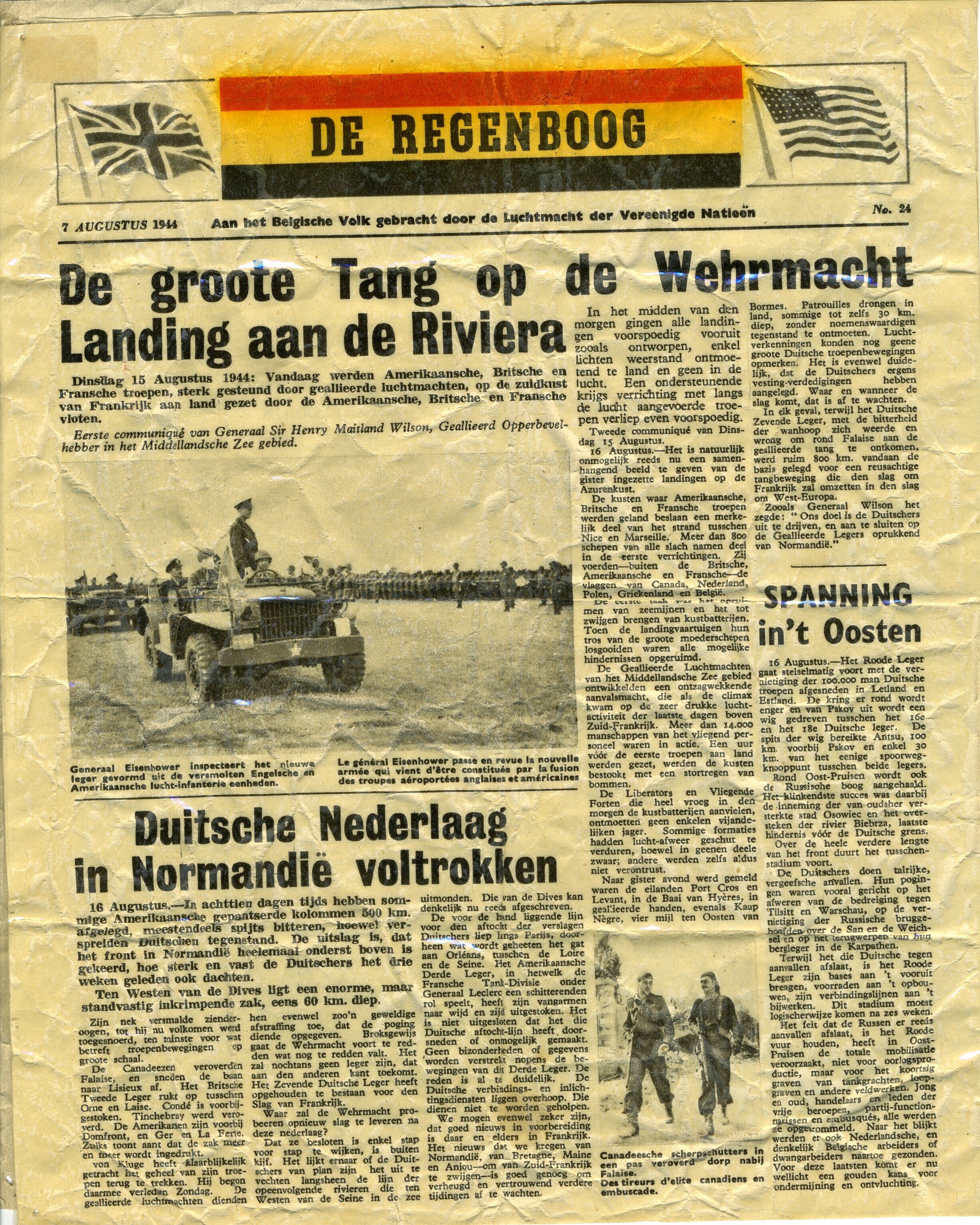 Exemplaar van de krant De Regenboog die door het ''vliegwezen der Vereenigde Naties'' werd verspreid. Het nieuws over de geallieerde opmars is zowel in het Nederlands als in het Frans weergegeven. De Franstalige versie, onder de titel ''L'Arc en Ciel'', is op de andere zijde van de krant gedrukt. Het betreft uitgave nummer 24 van 7 augustus 1944.