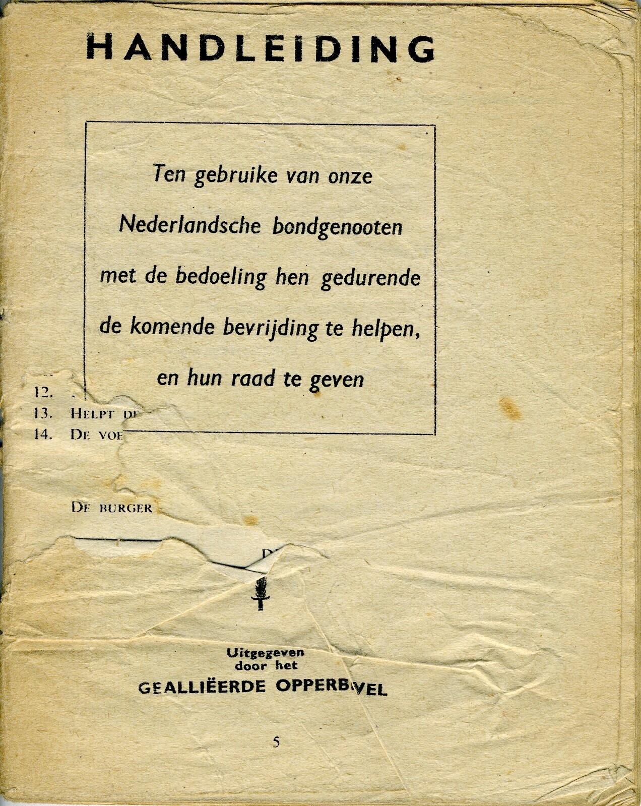 Twee exemplaren van een handleiding voor de Nederlandse bevolking met aanwijzingen en waarschuwingen in verband met de komende bevrijding. Er worden onder andere aangegeven hoe eerste hulp te verlenen en hoe men zich kan voorbereiden op bombardementen. De handleiding omvat 60 pagina's.