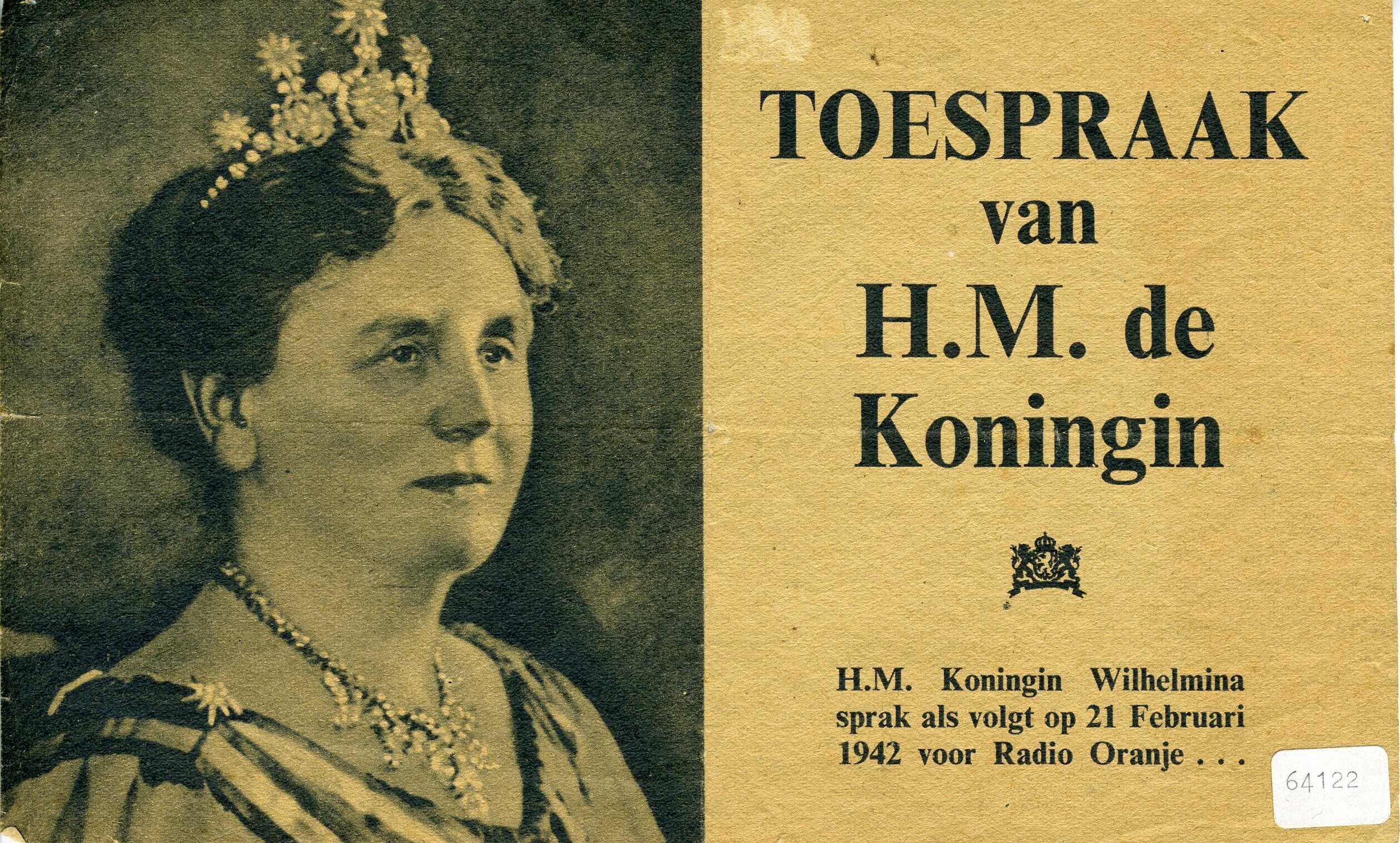 Een gedrukt pamflet met het portret van koningin Wilhelmina en de tekst: "Toespraak van H.M. de Koningin. H.M. Koningin Wilhelmina sprak als volgt op 21 Februari 1942 voor Radio Oranje..."