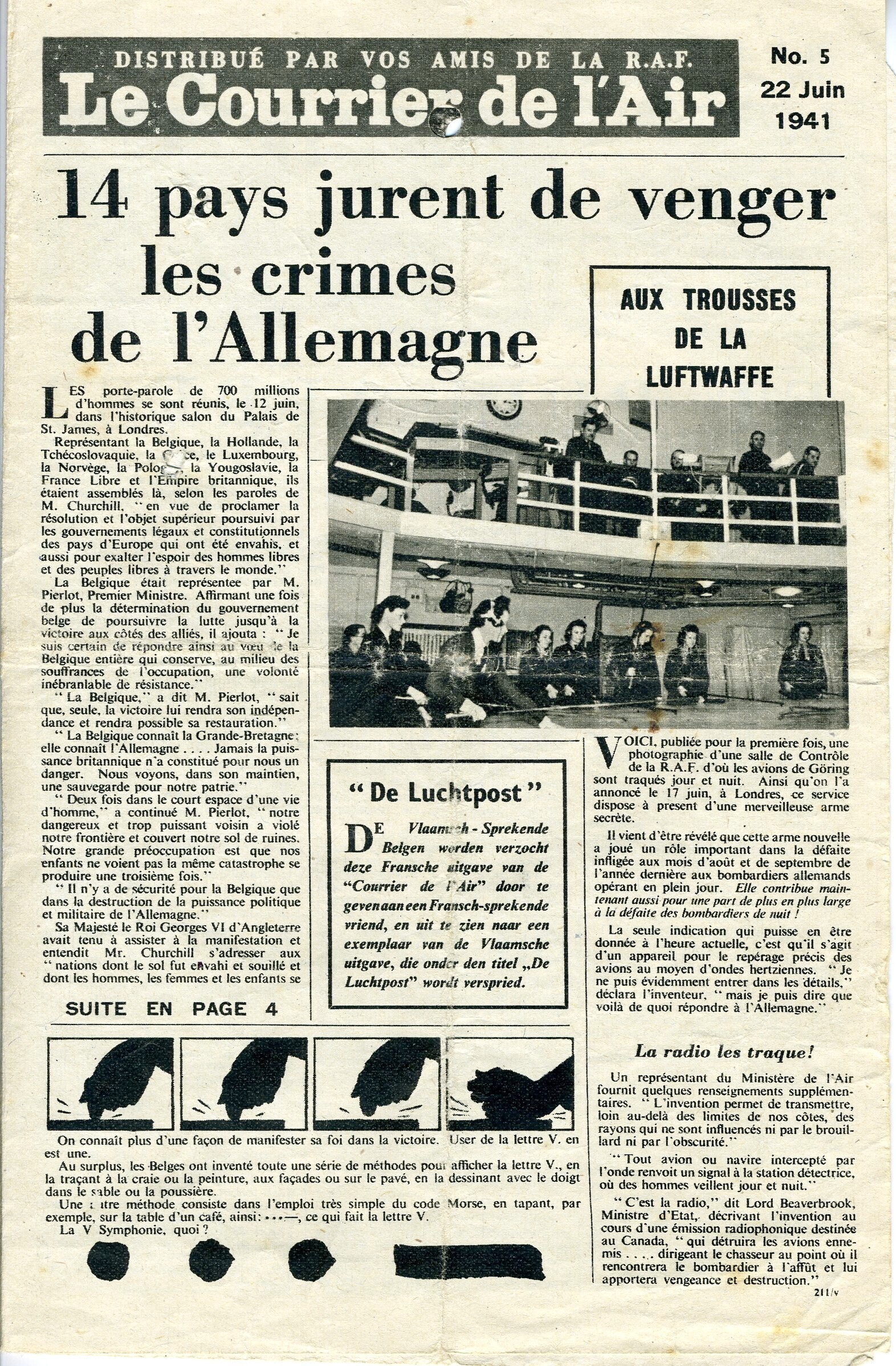 Exemplaar van Le Courrier de l'Air. Het betreft het nummer van 23 september 1943. De krant werd door de R,A,F. uitgeworpen boven franstalig gebied.
