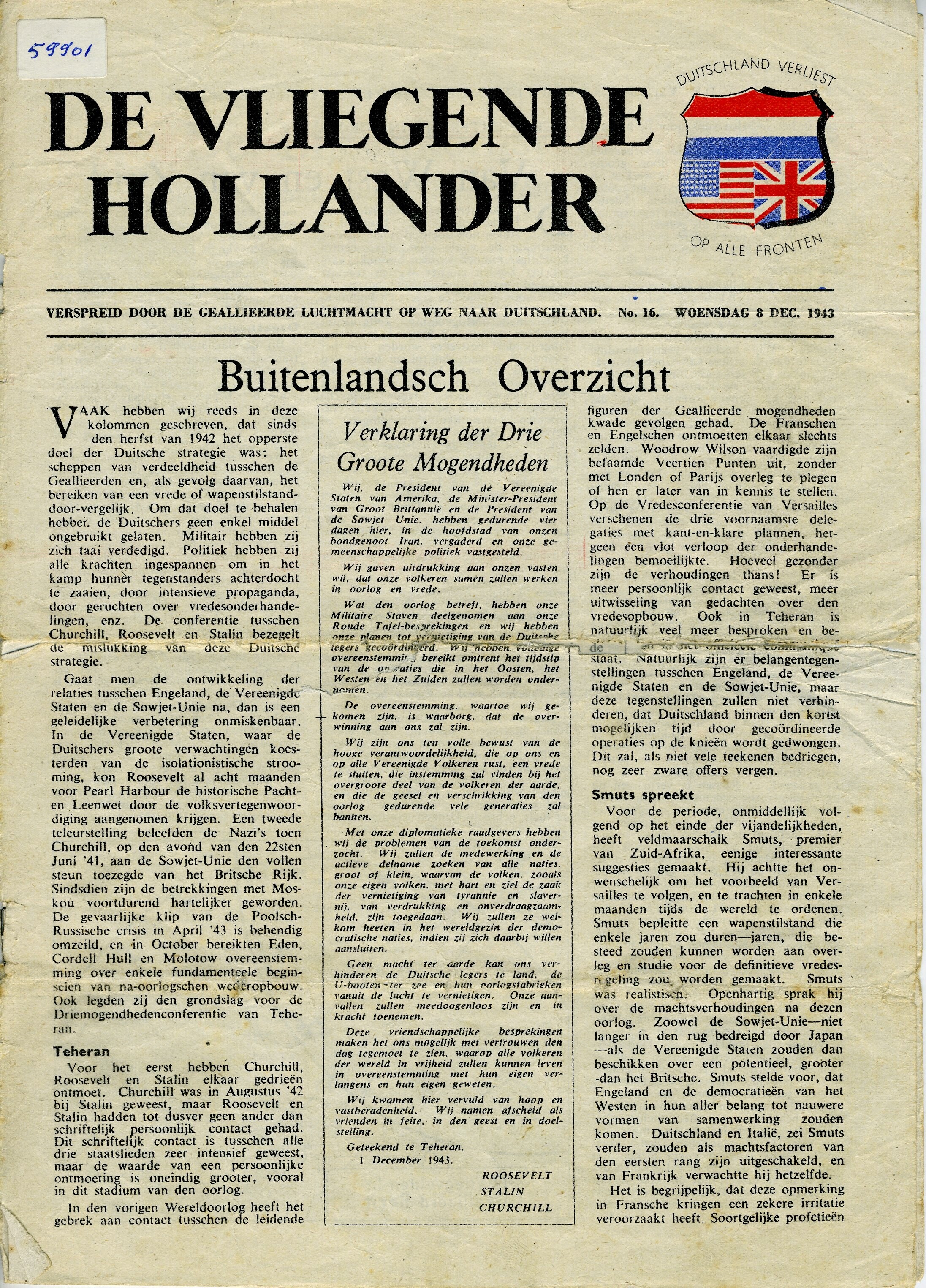 Editie 168 van woensdag 8 december 1943 van de verzetskrant ''De Vliegende Hollander''. De krant werd verspreid door de geallieerde luchtmacht. In deze editie aandacht voor het verdrag van Teheran.