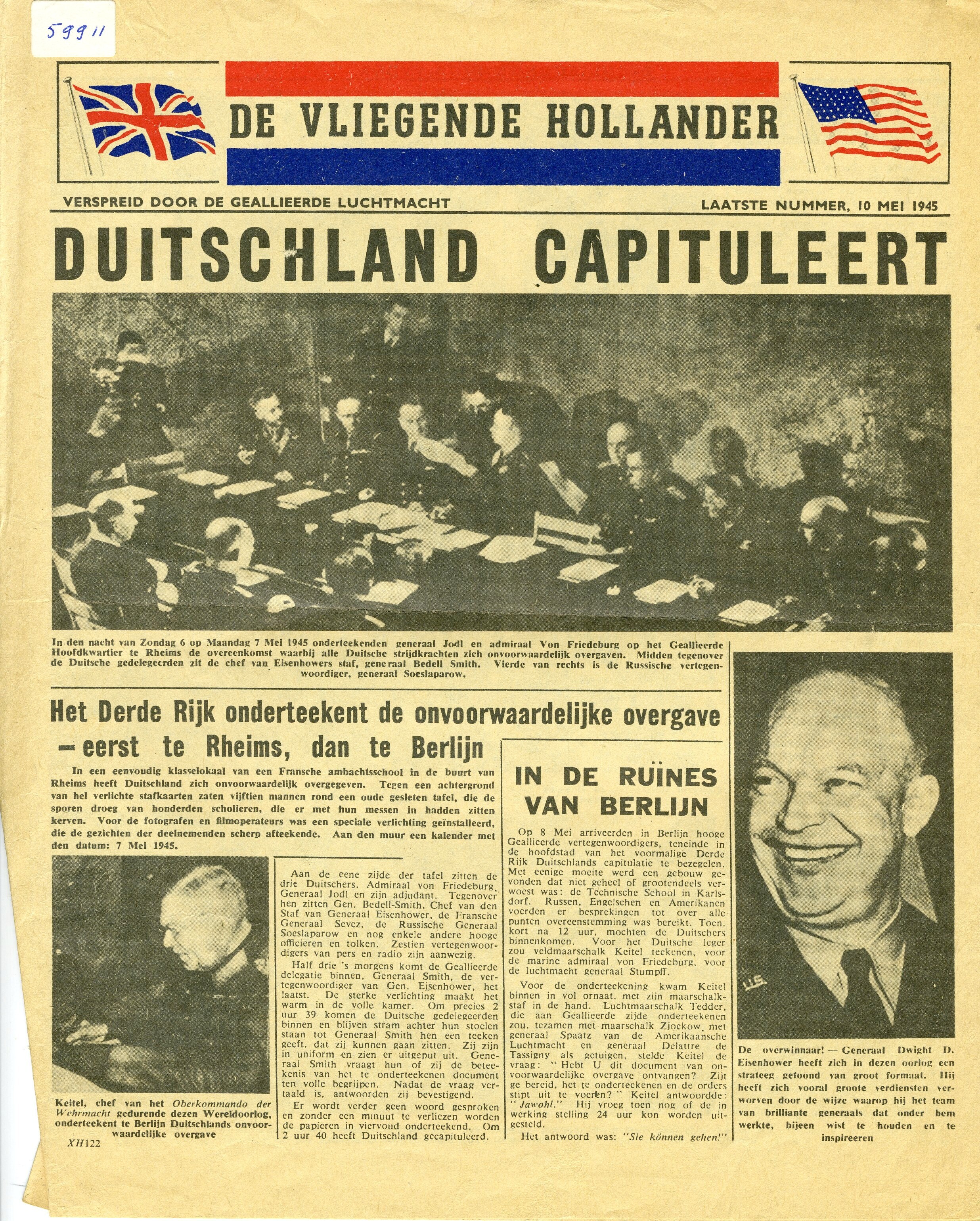 Laatste editie van woensdag 10 mei 1945 van de verzetskrant ''De Vliegende Hollander''. De krant werd verspreid door de geallieerde luchtmacht. In deze editie aandacht voor de capitulatie van Duitsland.