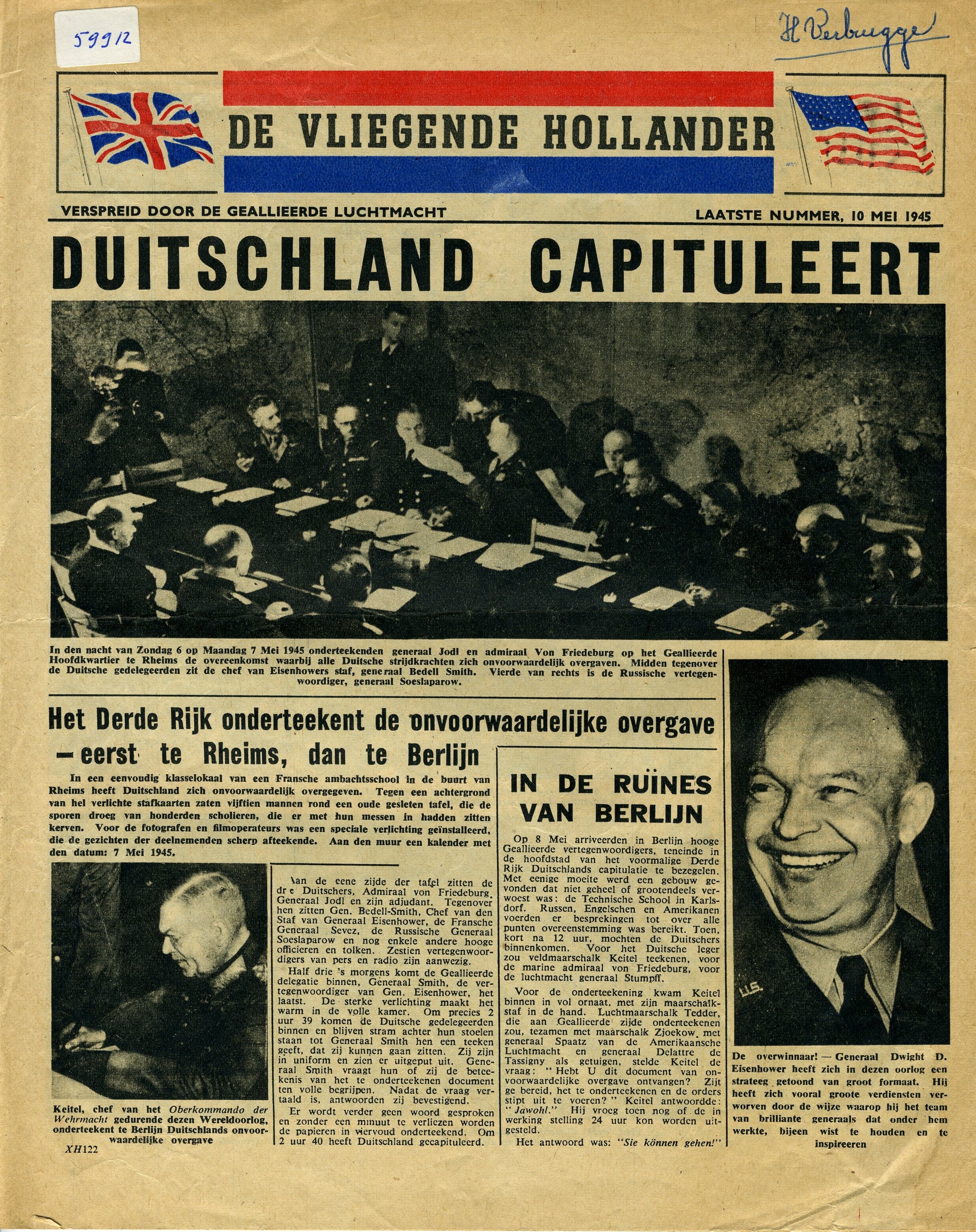 Laatste editie van woensdag 10 mei 1945 van de verzetskrant ''De Vliegende Hollander''. De krant werd verspreid door de geallieerde luchtmacht. In deze editie aandacht voor de capitulatie van Duitsland.
